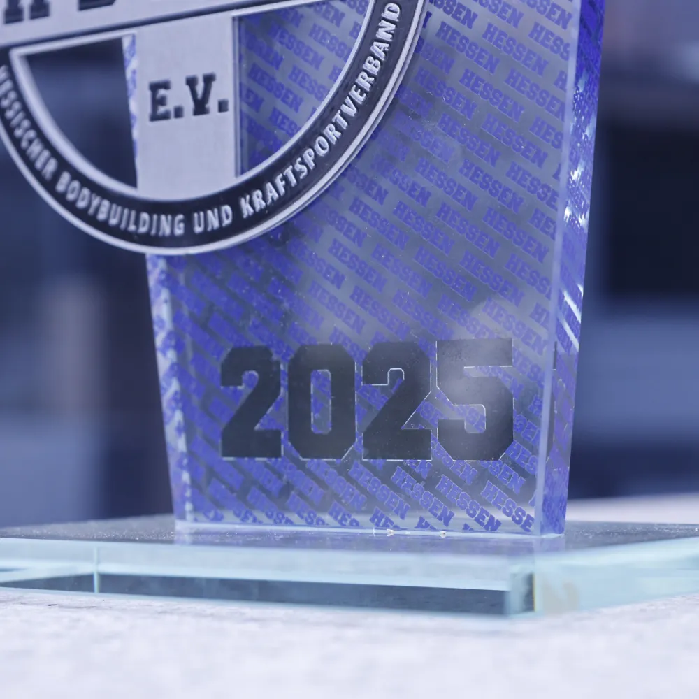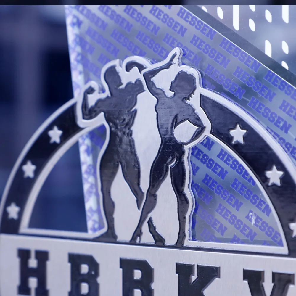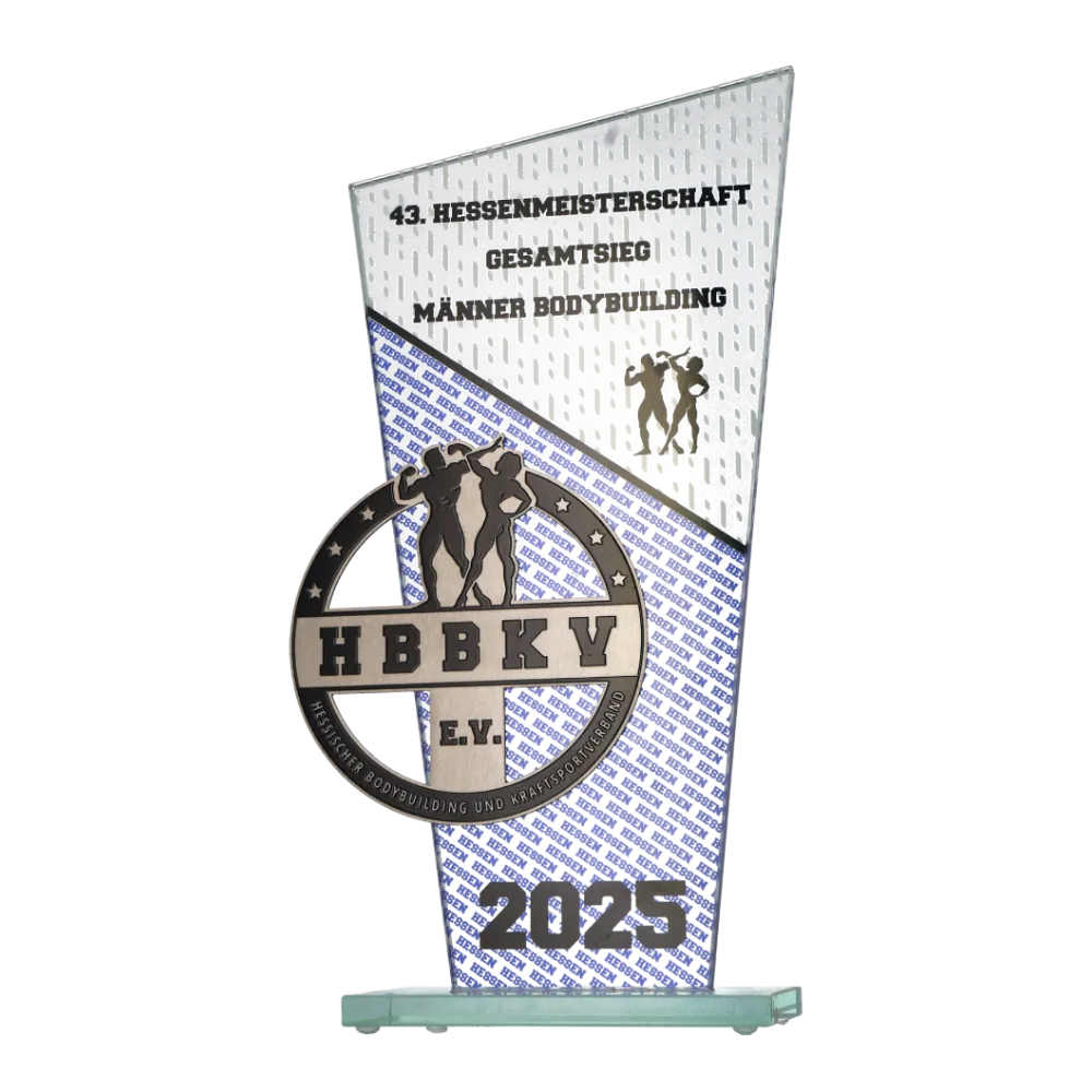 Un trofeo in vetro personalizzato progettato per la competizione di bodybuilding in Assia. Il trofeo presenta grafiche colorate realizzate con stampa UV, raffiguranti sagome di bodybuilder e l'iscrizione del nome dell'evento.