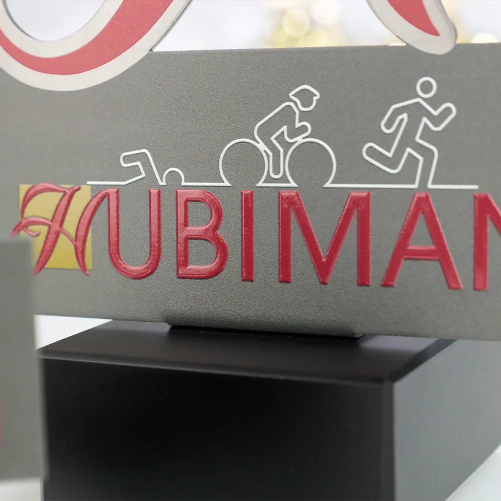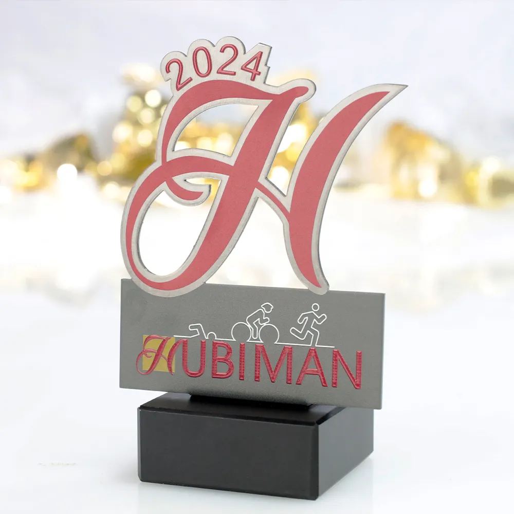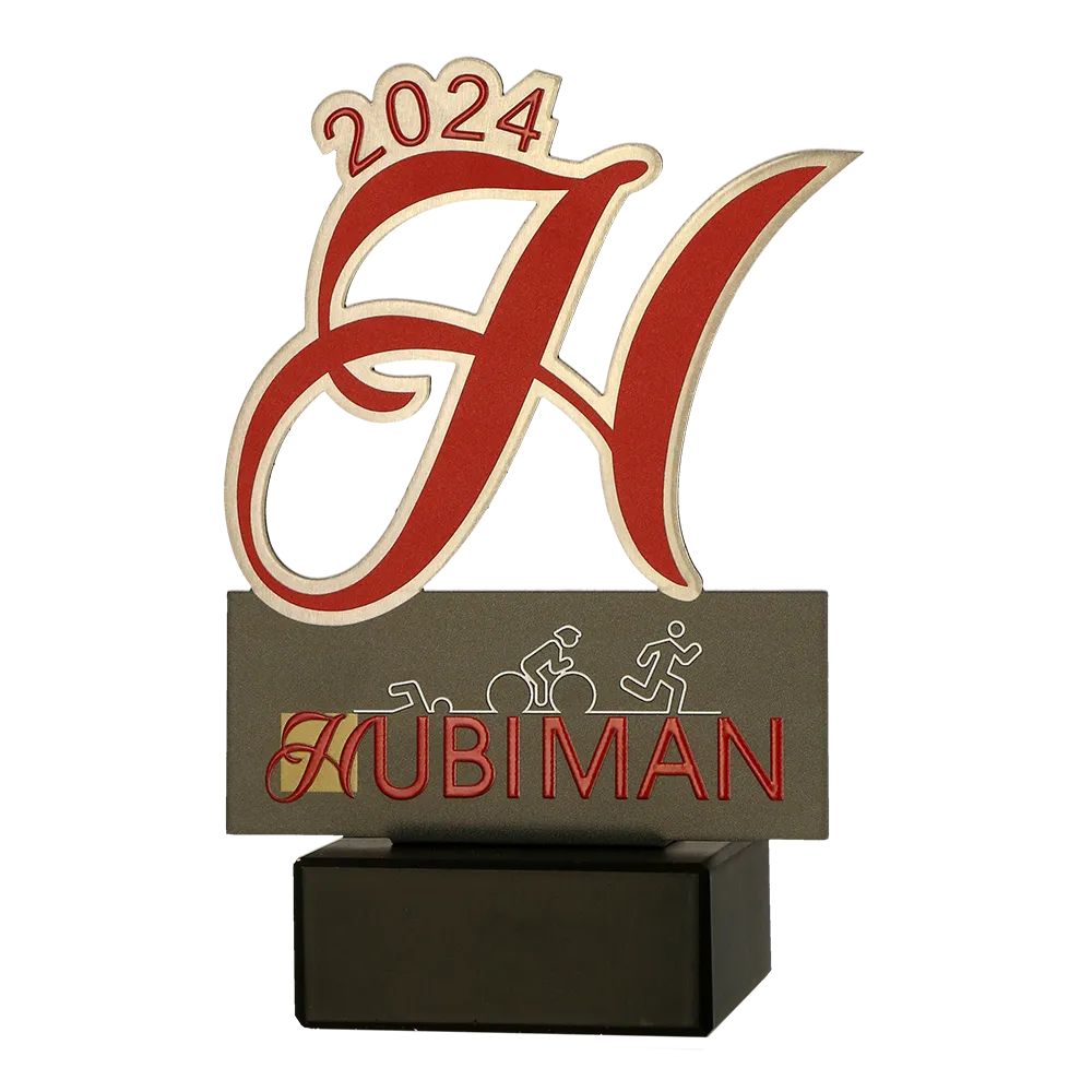 Il premio personalizzato progettato per l'Hubiman 2024 è un trofeo unico che combina stile classico e design moderno. Realizzato in metallo, il premio assume la forma di una grande lettera "H" stilizzata, che simboleggia il nome dell'evento. Gli accenti rossi e i dettagli sono stati stampati con precisione utilizzando la tecnologia UV, aggiungendo vivacità al trofeo. In basso, sulla superficie metallica, sono raffigurate le immagini delle tre discipline del triathlon, evidenziando perfettamente la natura sportiva dell'evento.