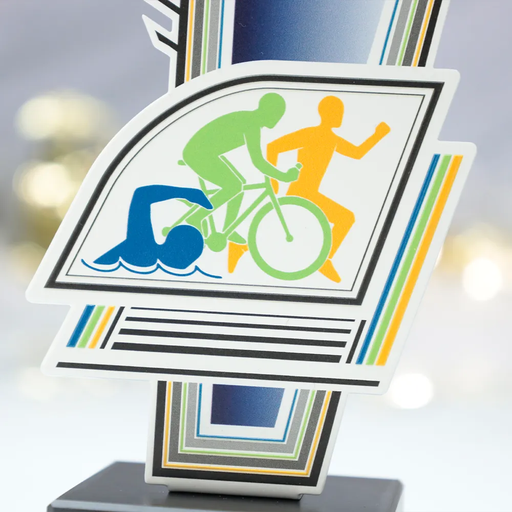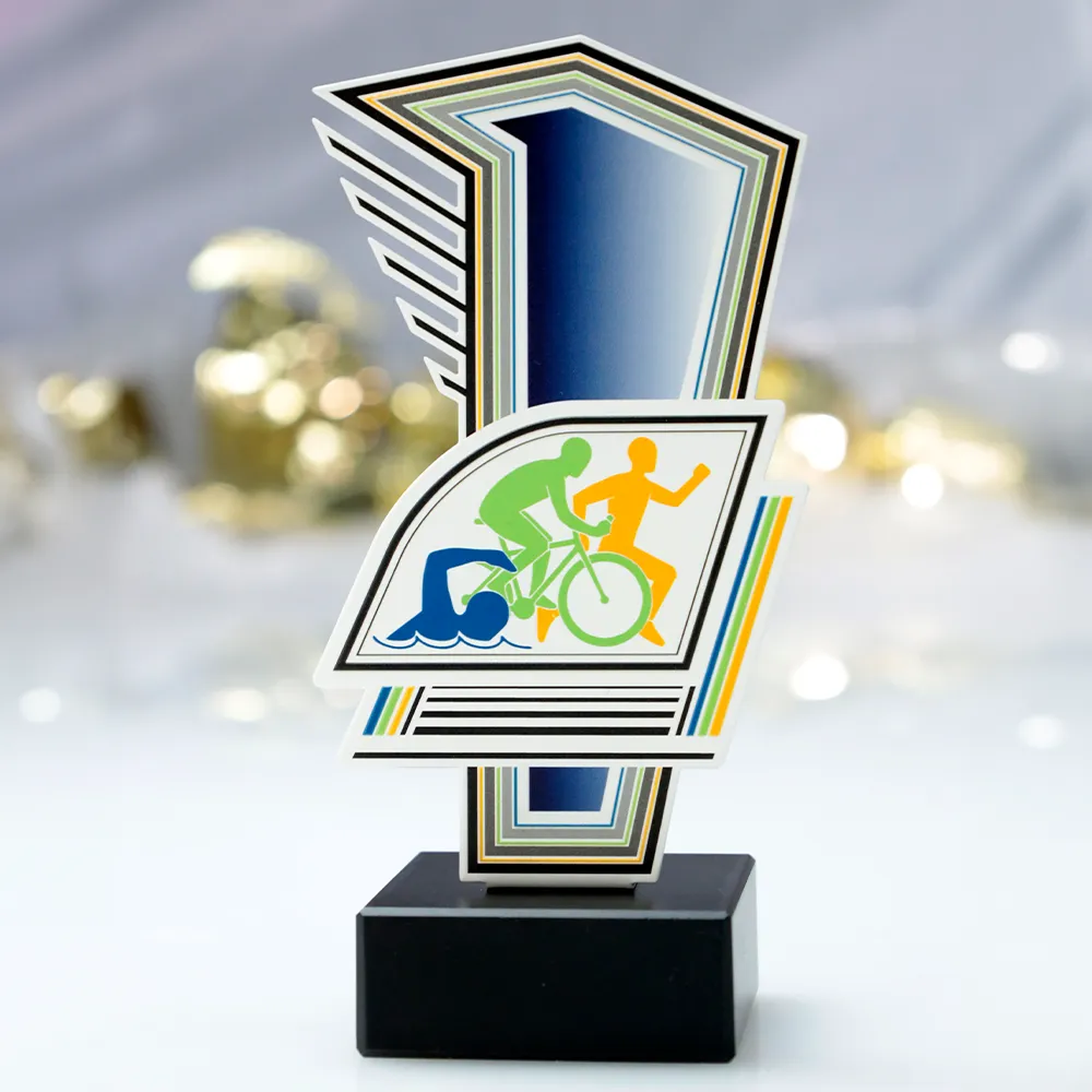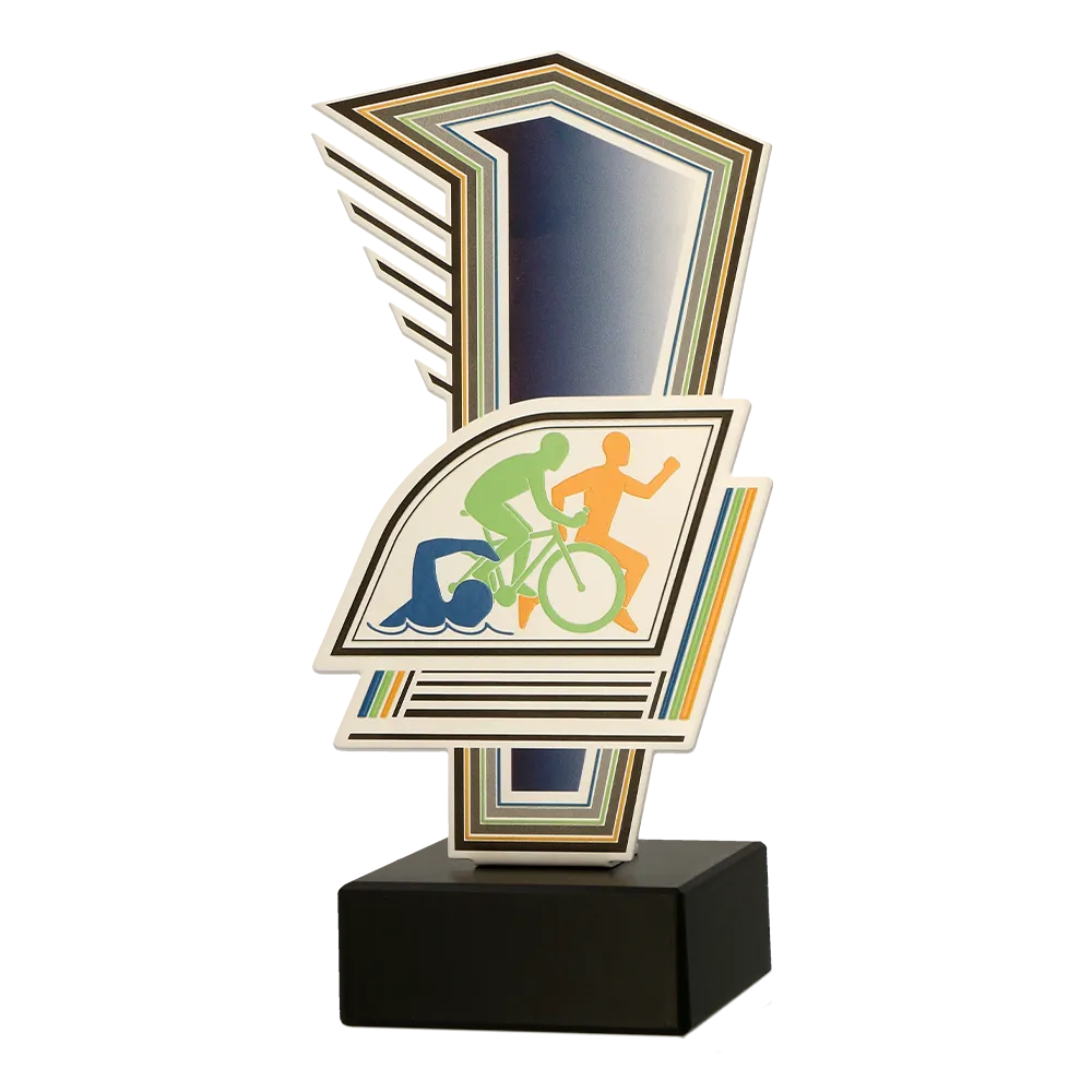 Un trofeo personalizzato progettato per un evento. Il trofeo ha la forma di un grande numero "1" con sagome colorate di atleti – un nuotatore, un ciclista e un corridore. Tutte le decorazioni sono state applicate utilizzando la stampa UV, conferendo loro colori vivaci. La forma è stata tagliata al laser per ottenere contorni precisi.