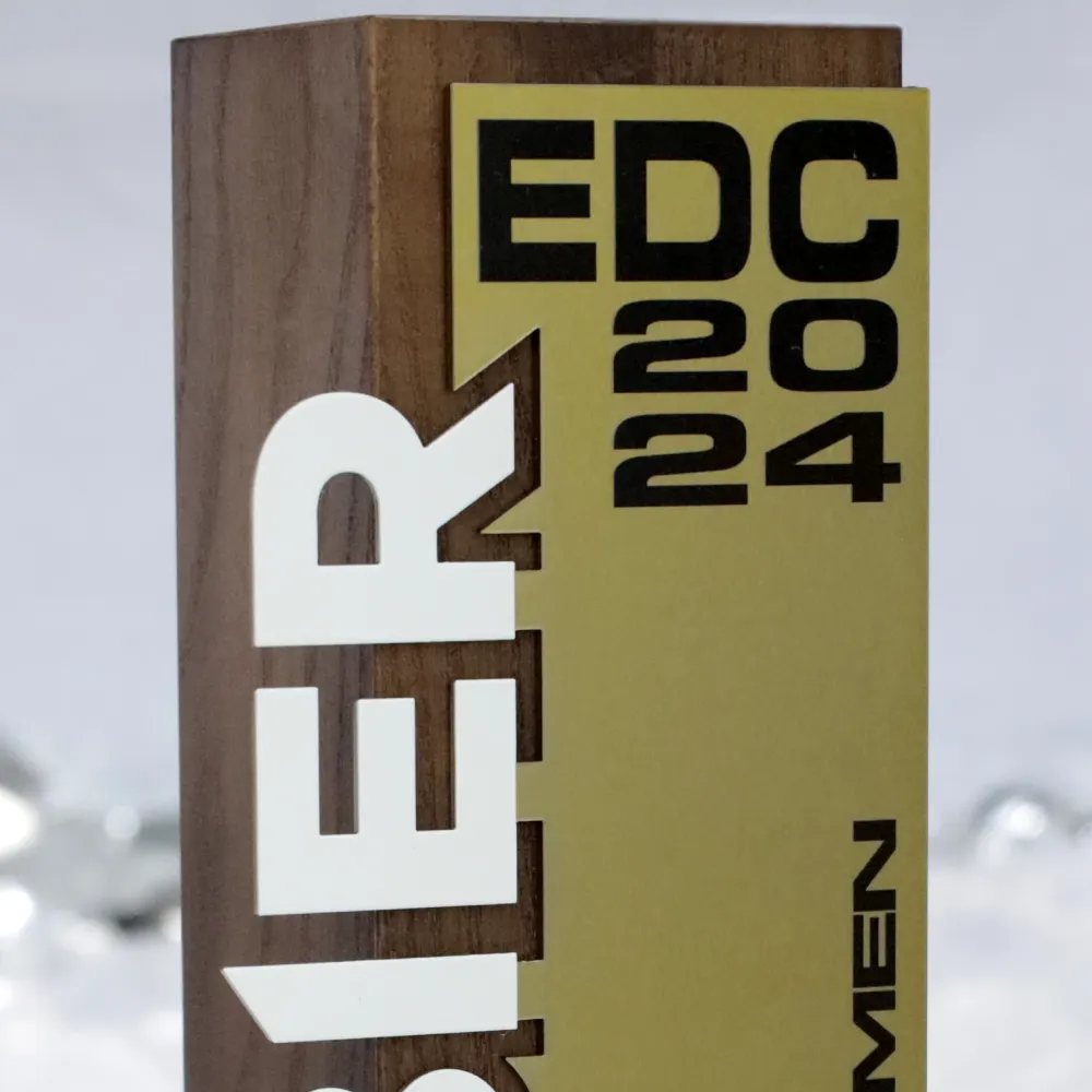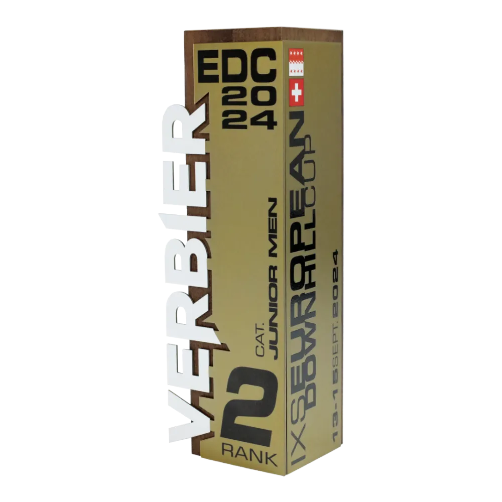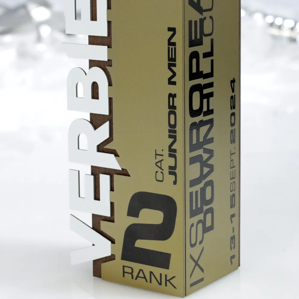 Il premio ciclismo progettato per l'IXS European Downhill Cup combina legno e metallo, conferendogli un aspetto moderno ma elegante. La base in legno fornisce una solida fondazione, su cui sono montati elementi in metallo tagliati al laser, creando un chiaro effetto tridimensionale. Il trofeo presenta grafiche realizzate con stampa UV, garantendo che i colori siano vibranti e duraturi.