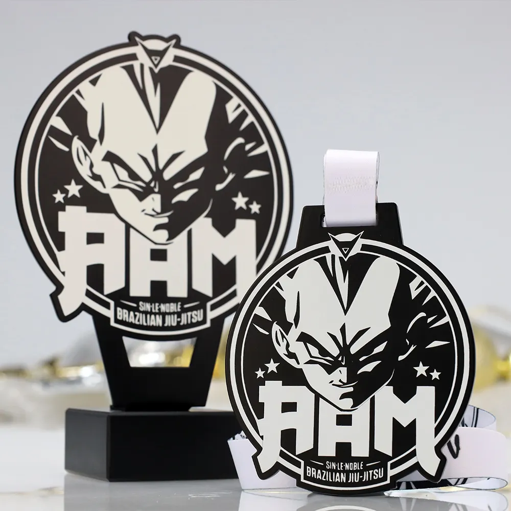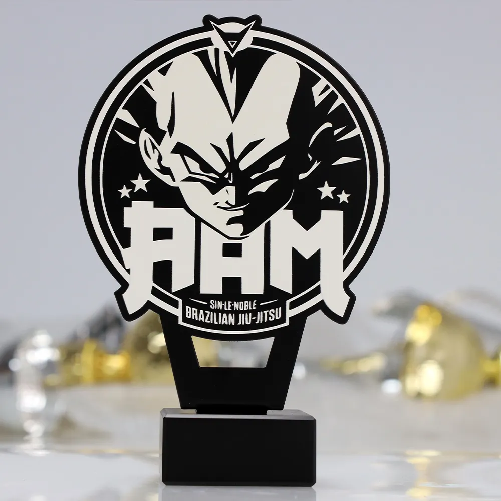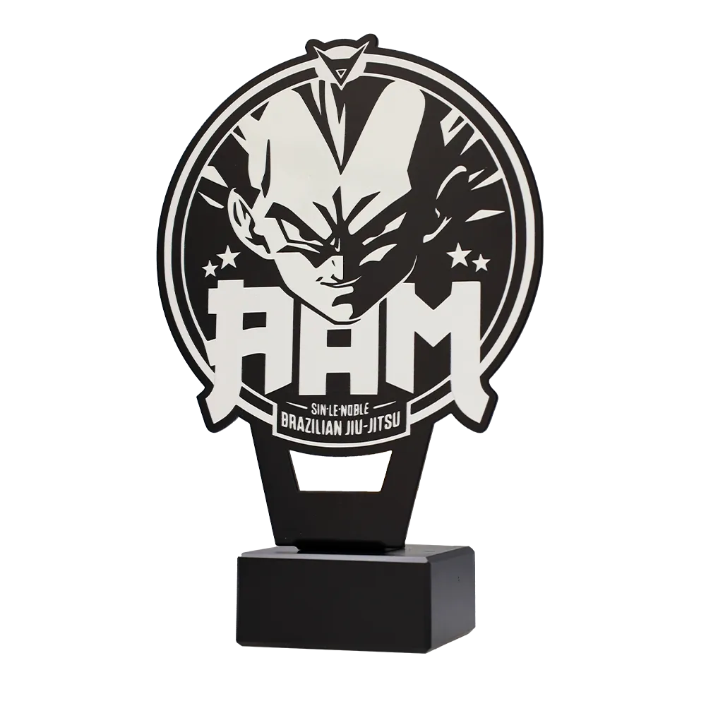 Un originale trofeo sportivo progettato per un evento di Brazilian Jiu-Jitsu. Il trofeo è stato realizzato in acciaio, tagliato al laser e decorato con stampa UV in bianco e nero. Un design dinamico con una figura ispirata alla cultura pop attira l'attenzione e si adatta perfettamente al carattere dell'evento. L'intero pezzo è montato su un'elegante base in marmo.
