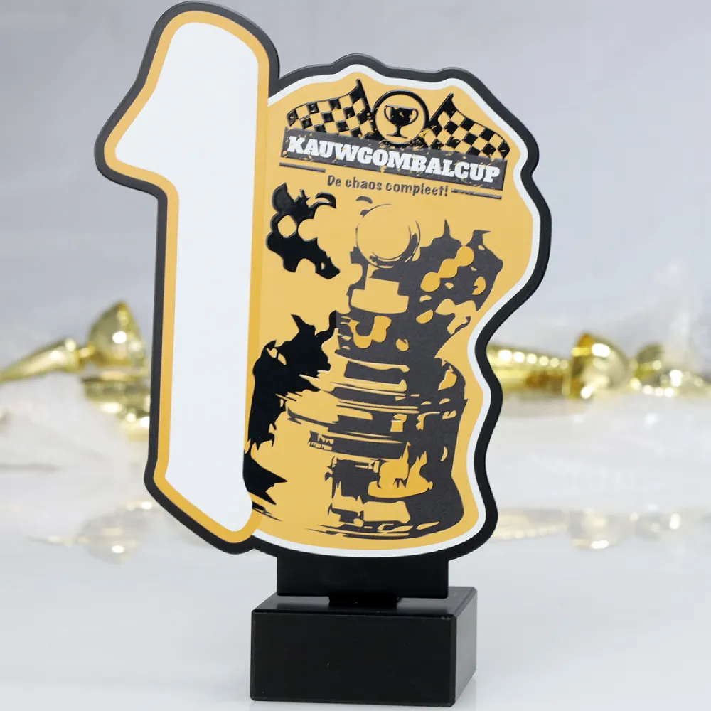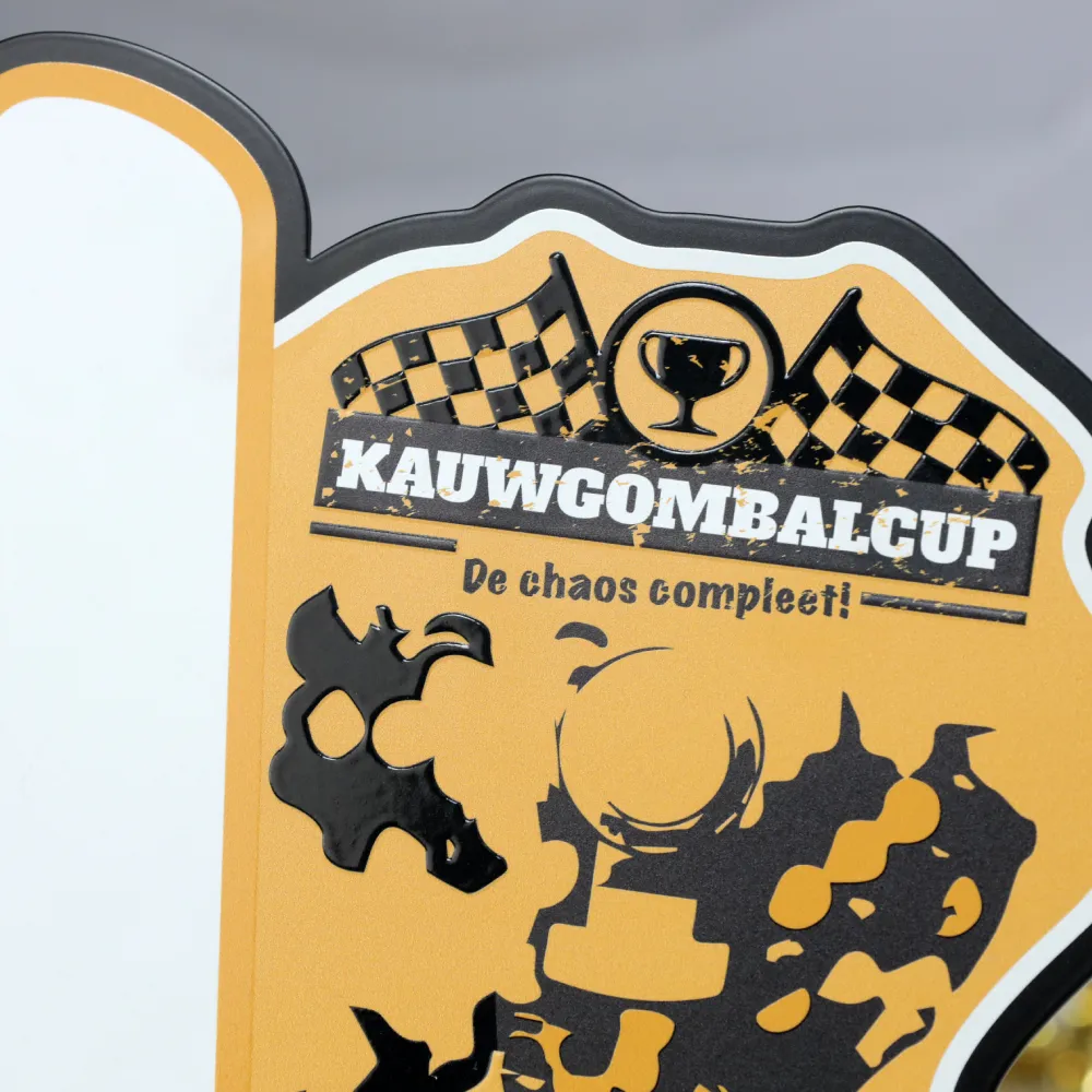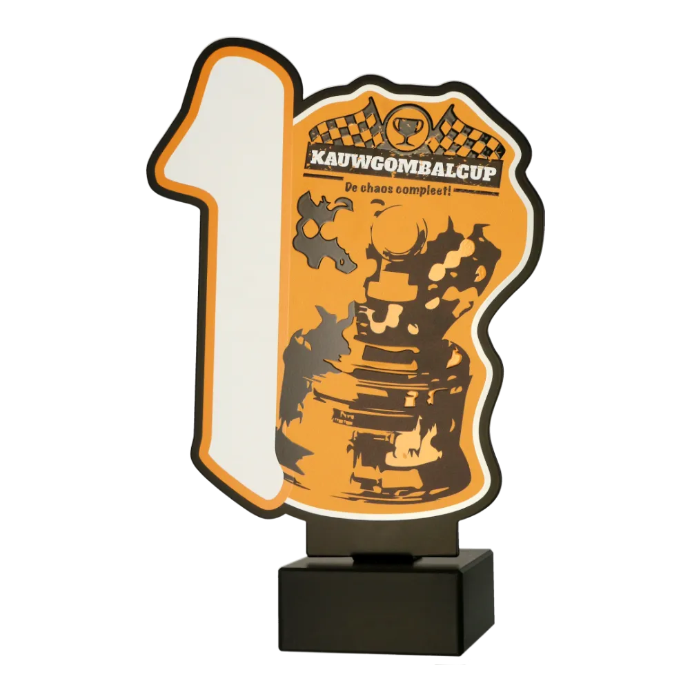 Un eccezionale trofeo motorsport progettato per l'evento Kauwgombalcup, noto per la sua atmosfera energica e dinamica. La caratteristica principale è una grafica di una coppa ed elementi distintivi dell'evento su uno sfondo arancione vivace.