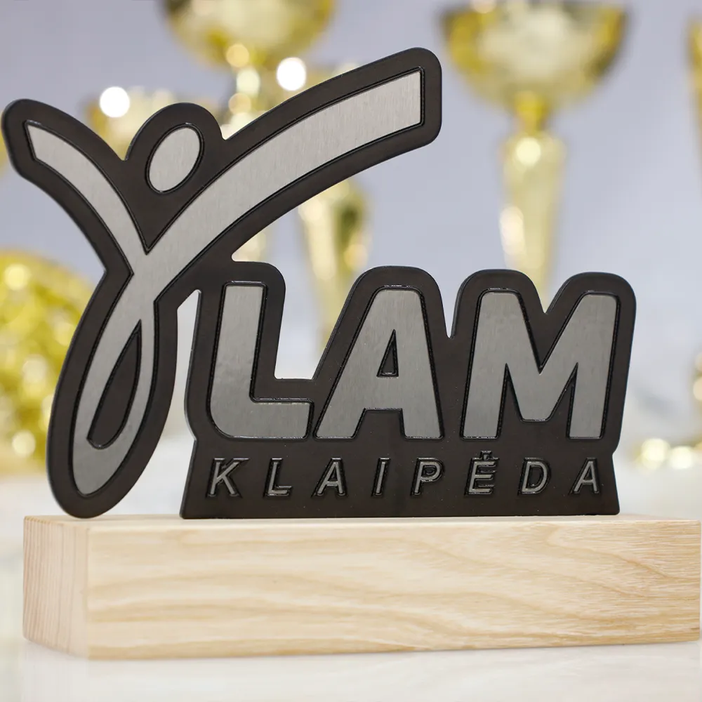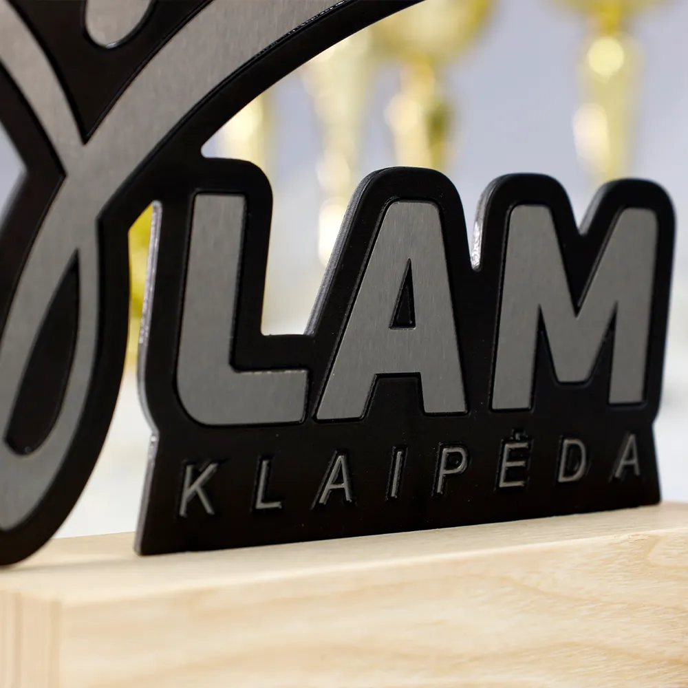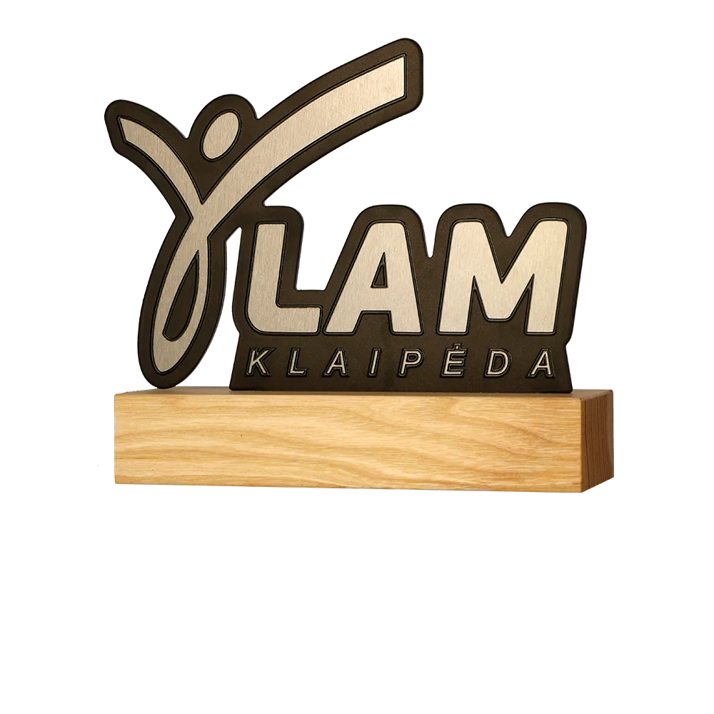 Trofeo running creato per l'evento LAM Klaipėda. L'elemento chiave del design è una silhouette dinamica di una persona in movimento, perfettamente integrata nel logo dell'evento. Il trofeo è realizzato da una combinazione di acciaio di alta qualità e legno resistente. La base in legno conferisce al design un tocco naturale. Grazie al preciso taglio laser, sono stati ottenuti contorni netti e dettagli impeccabili.