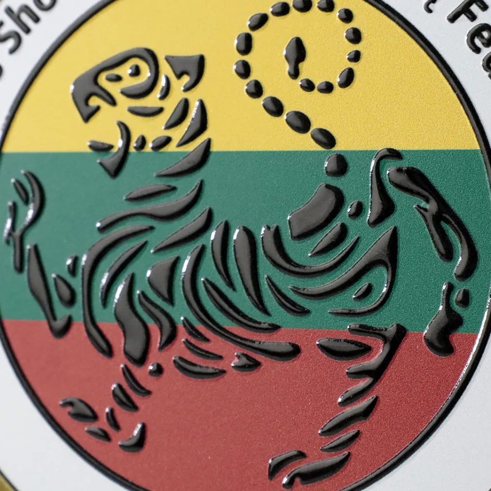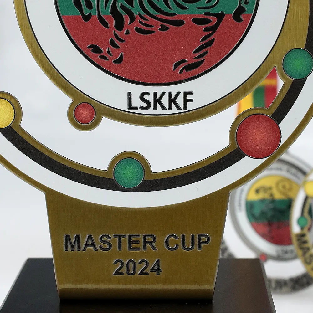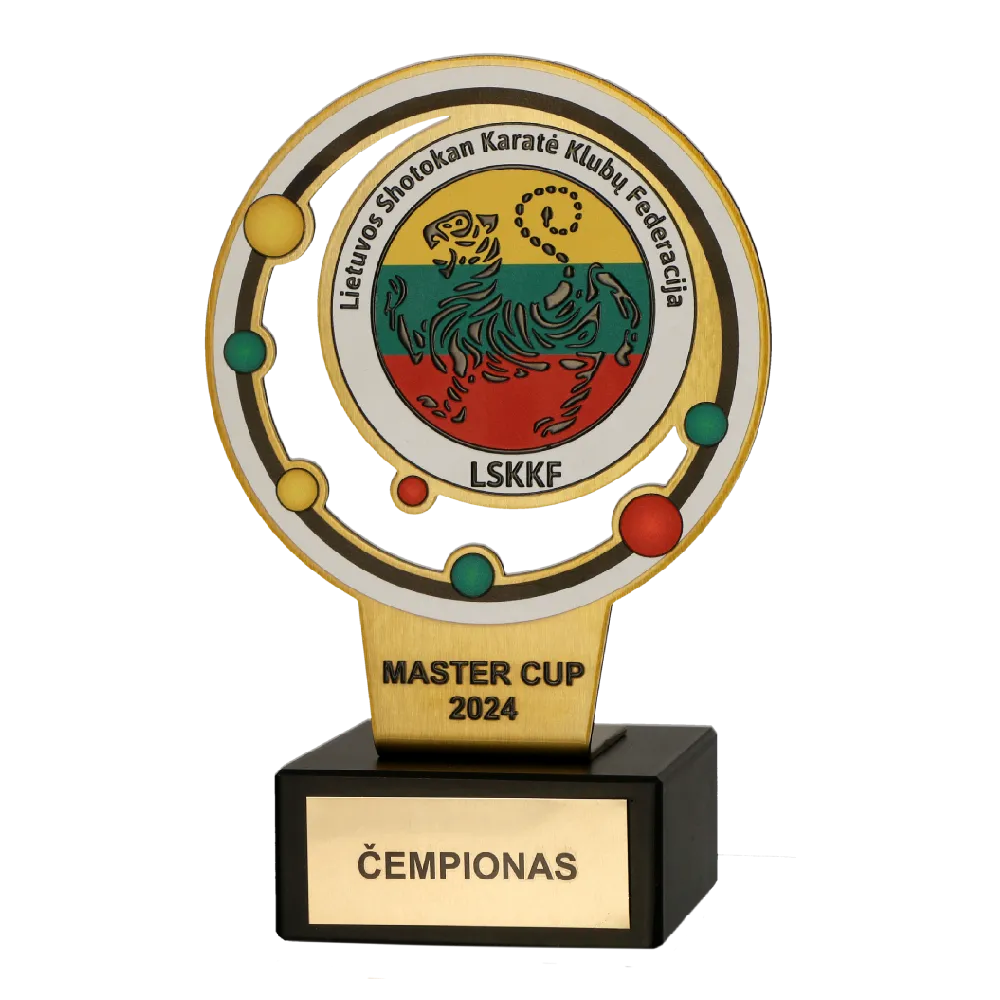 Un premio personalizzato progettato specificamente per la competizione della Lietuvos Shotokan Karatė Klubų Federacija. Il trofeo ha una forma rotonda, realizzato in solido metallo color oro, con dettagli colorati che raffigurano il logo della federazione. Il motivo centrale è una tigre sullo sfondo della bandiera lituana.