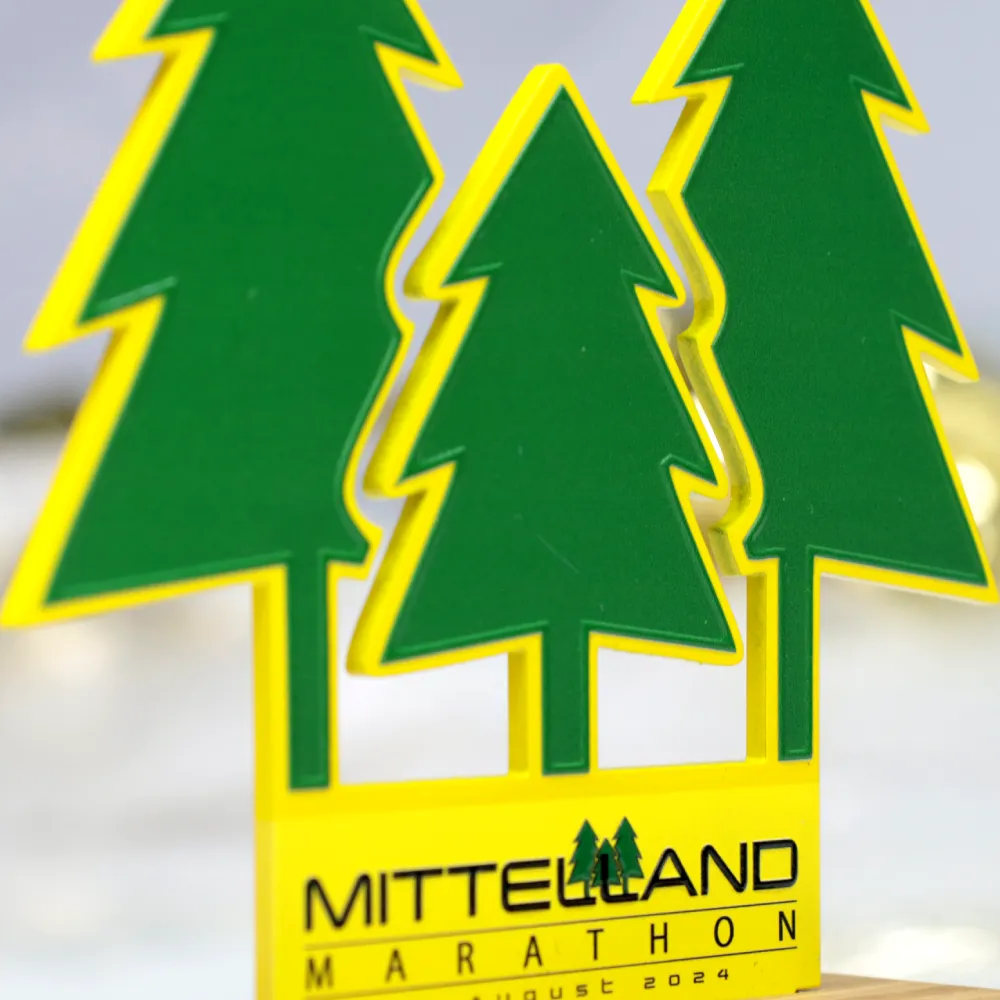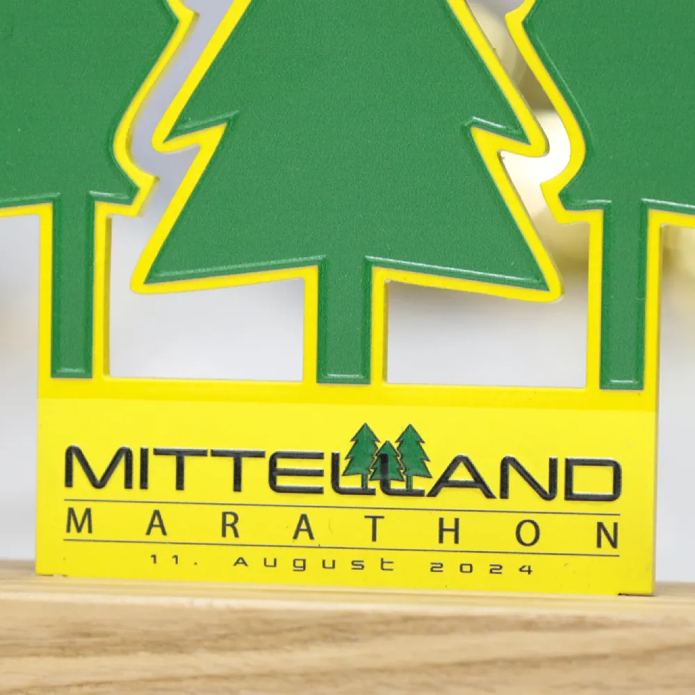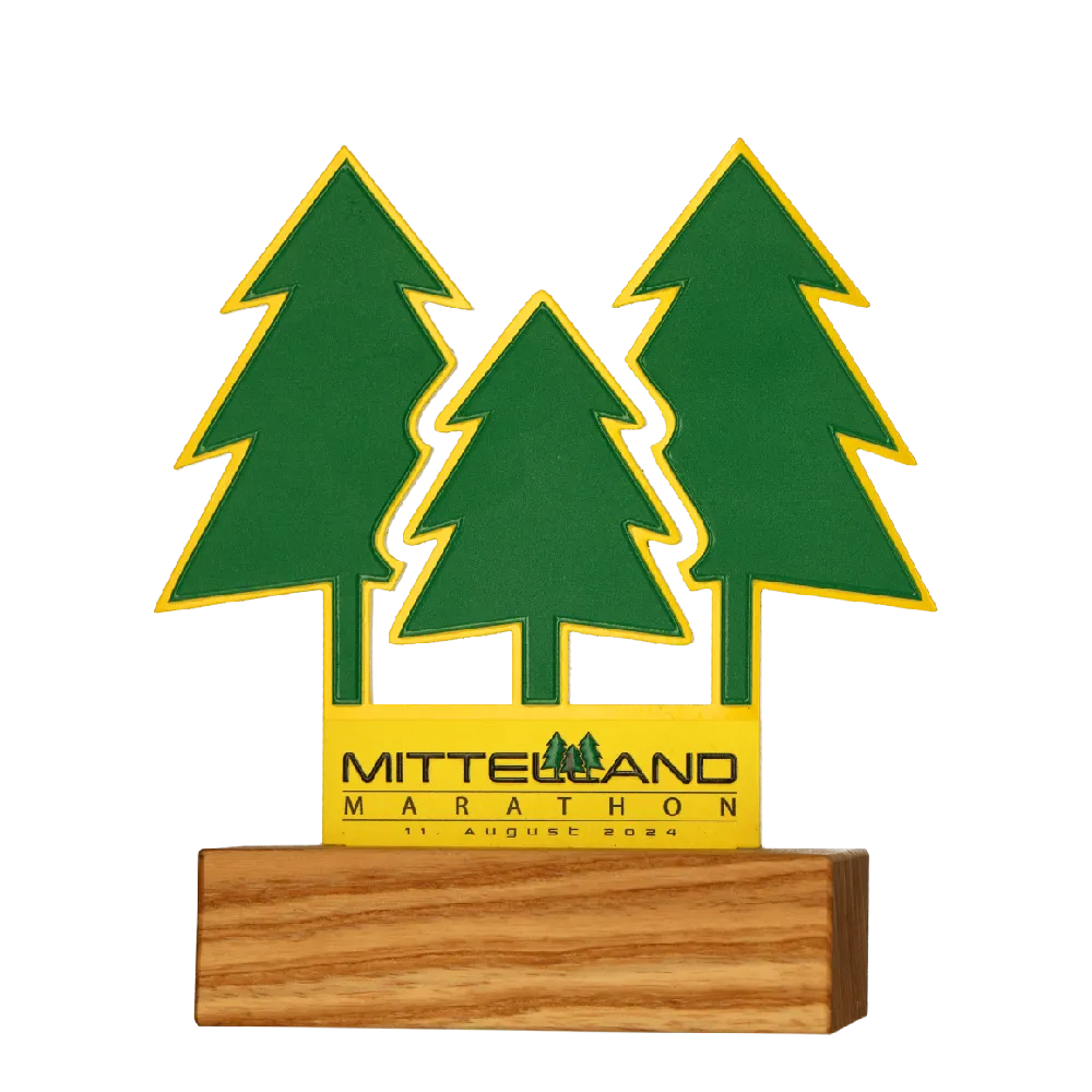 Il trofeo running personalizzato progettato per la Mittelland Marathon 2024 è realizzato in metallo, sagomato per rappresentare alberi che simboleggiano la natura e i percorsi di corsa di questa maratona. La parte in metallo è stata tagliata con precisione al laser e decorata con stampa UV colorata. Il trofeo è montato su una solida base in legno, sottolineando il suo legame con la natura.
