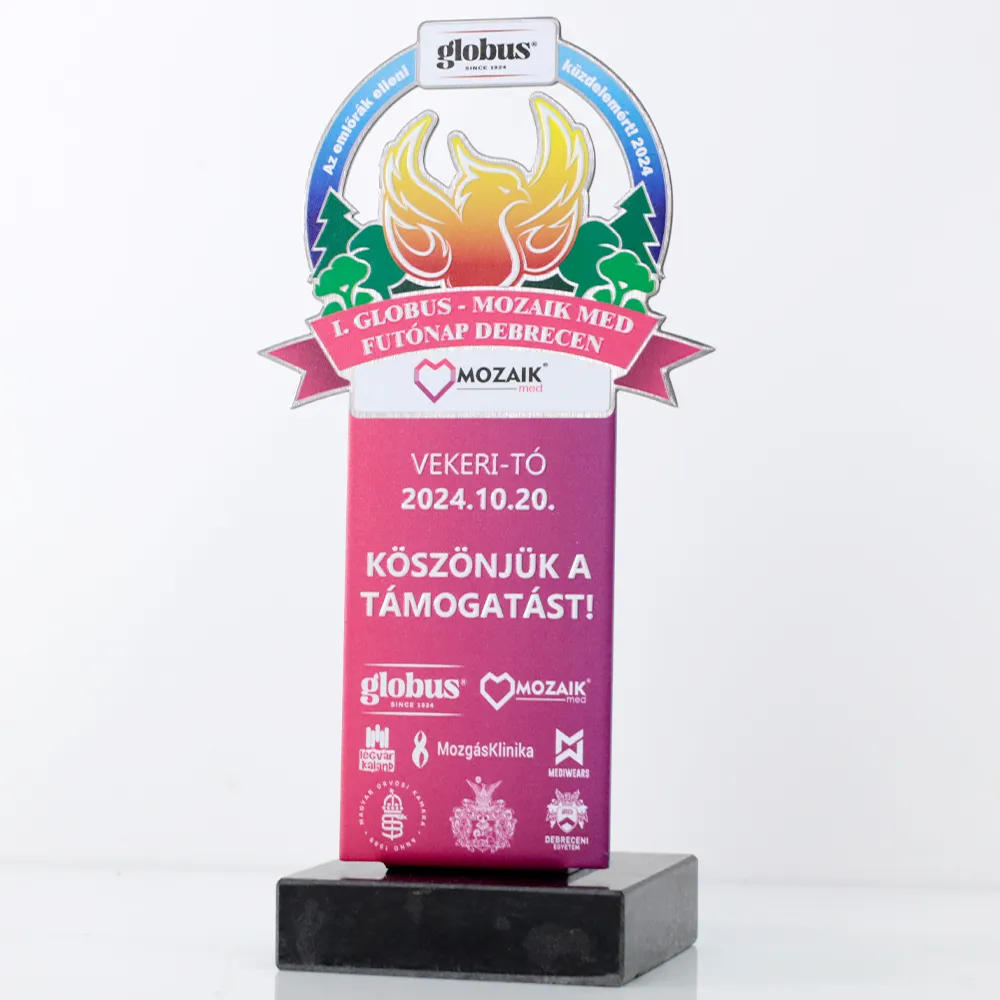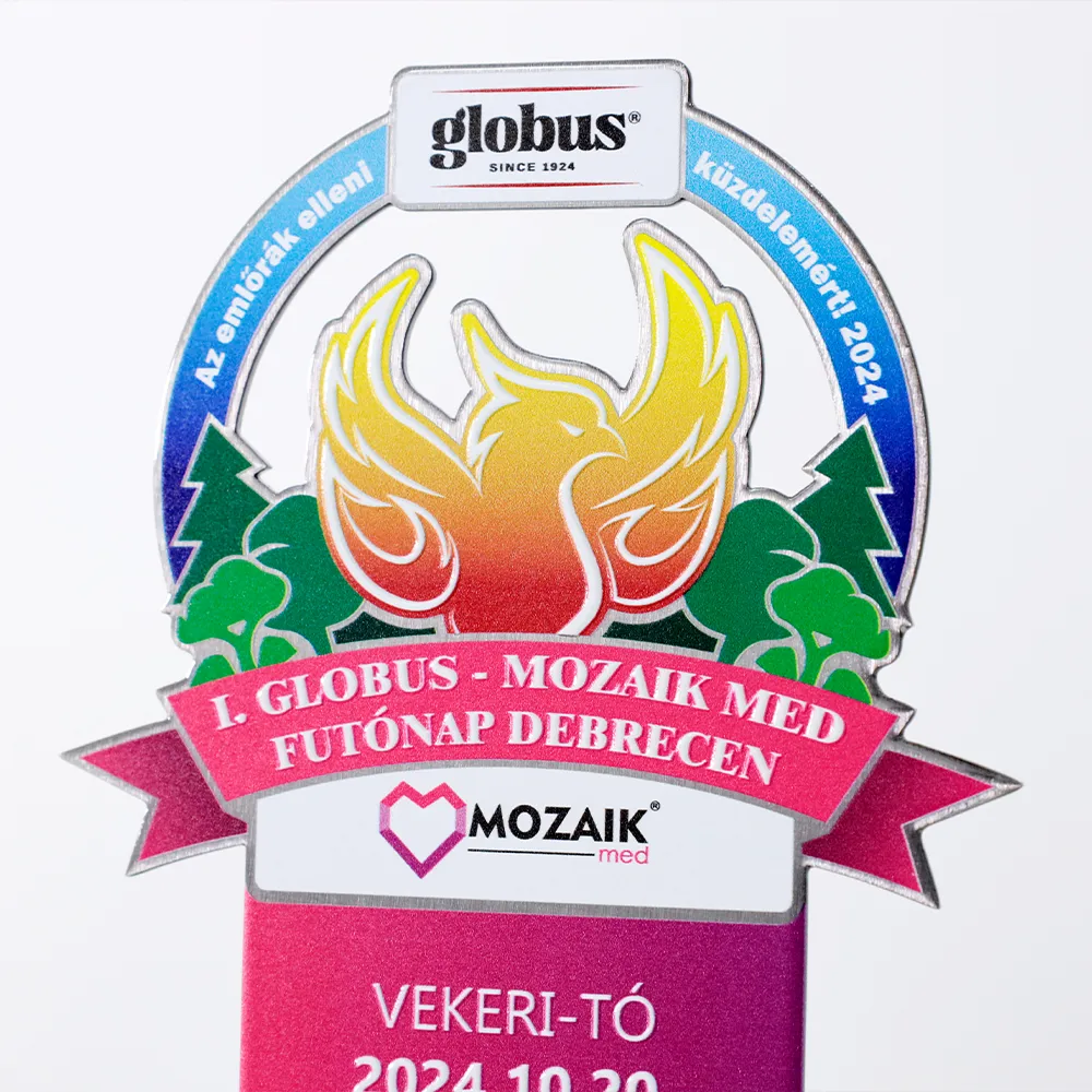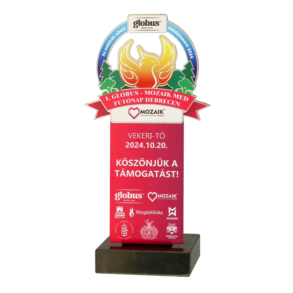 Premio running personalizzato progettato specificamente per "I. Globus - Mozaik Med Futónap Debrecen," commemorando la prima edizione di questo evento podistico unico a Debrecen. Il trofeo impressiona con le sue grafiche colorate, con un motivo centrale di fiamma circondato da elementi ispirati alla natura come alberi e il lago Vekeri. In basso, la data, il luogo e i loghi degli sponsor sono visualizzati, completando il suo design unico.