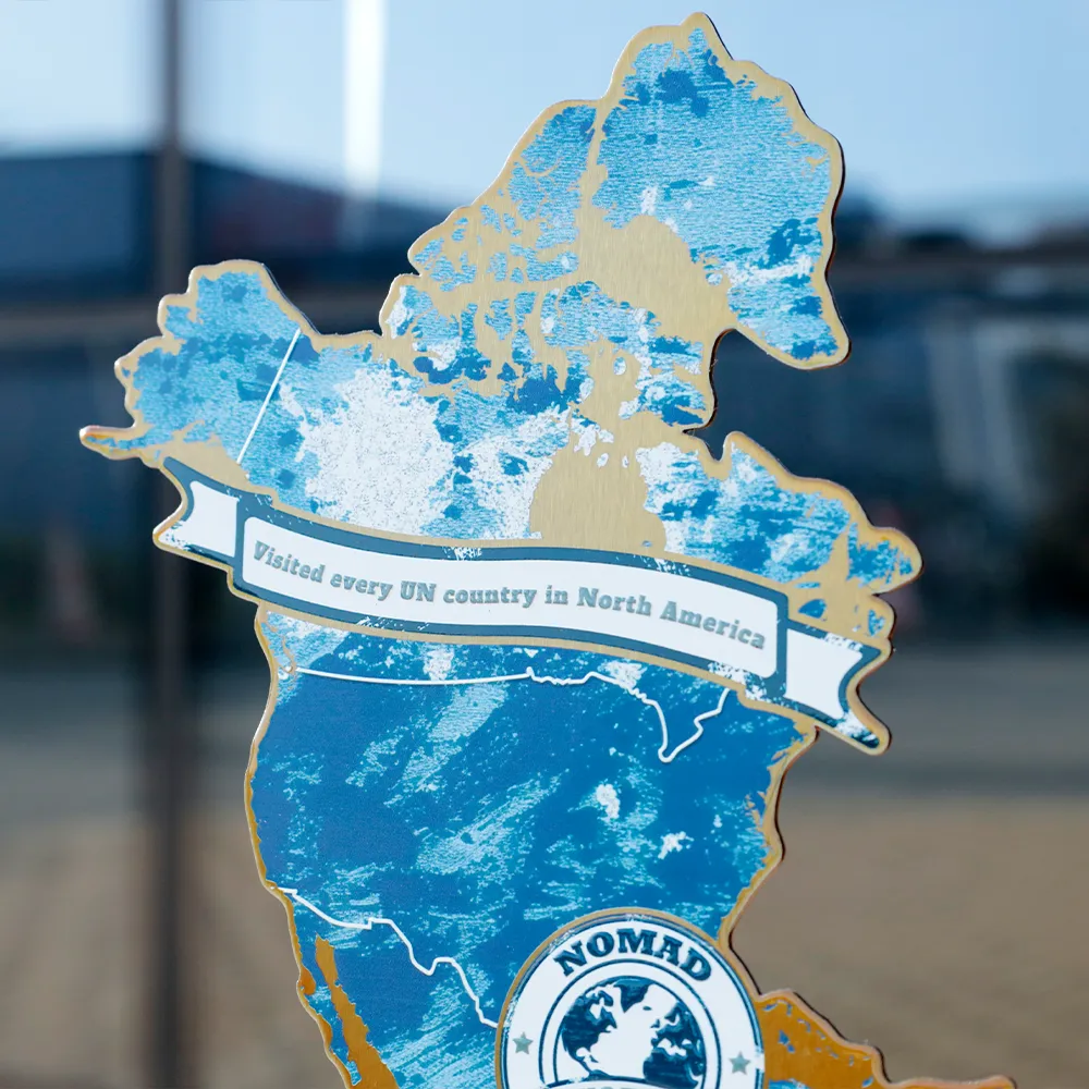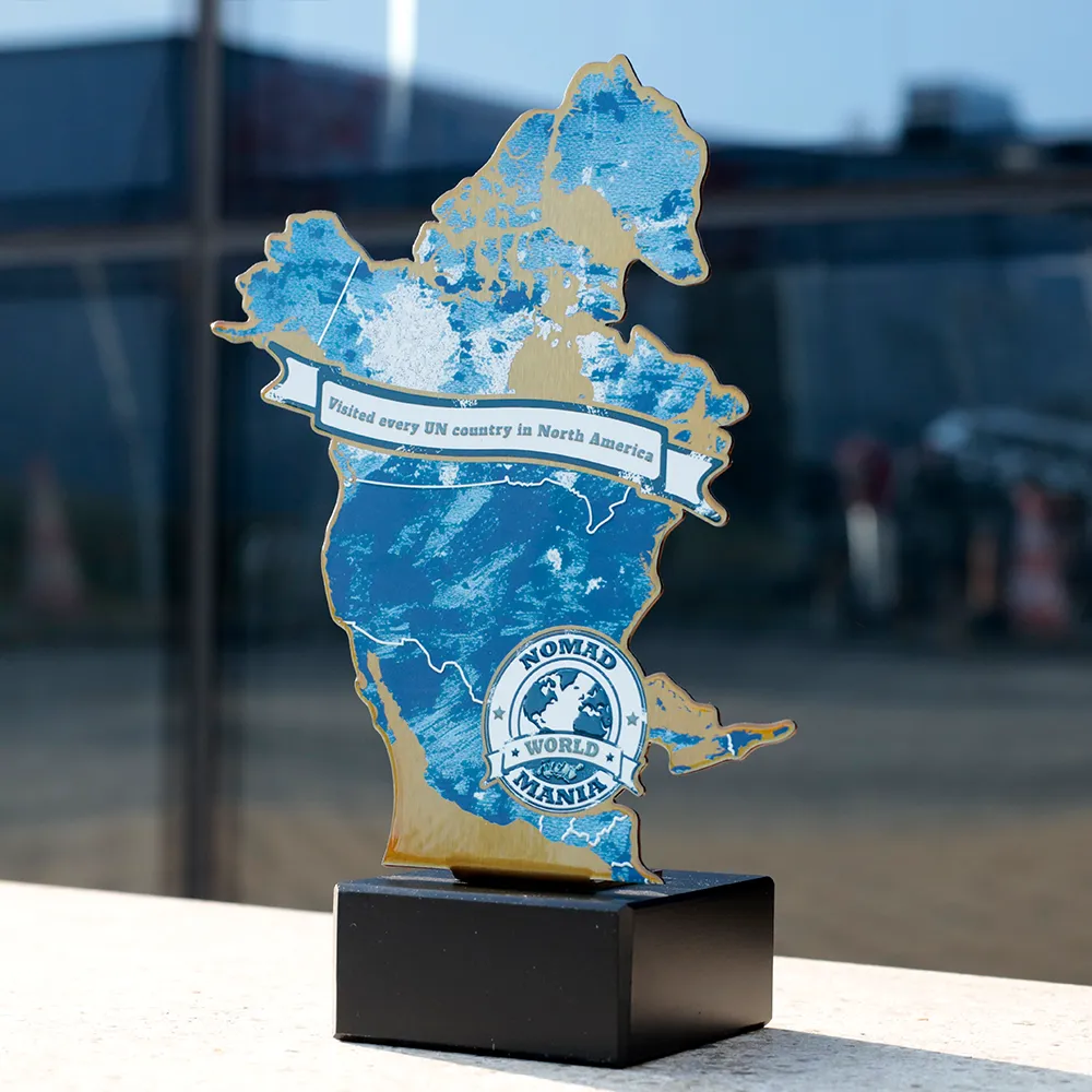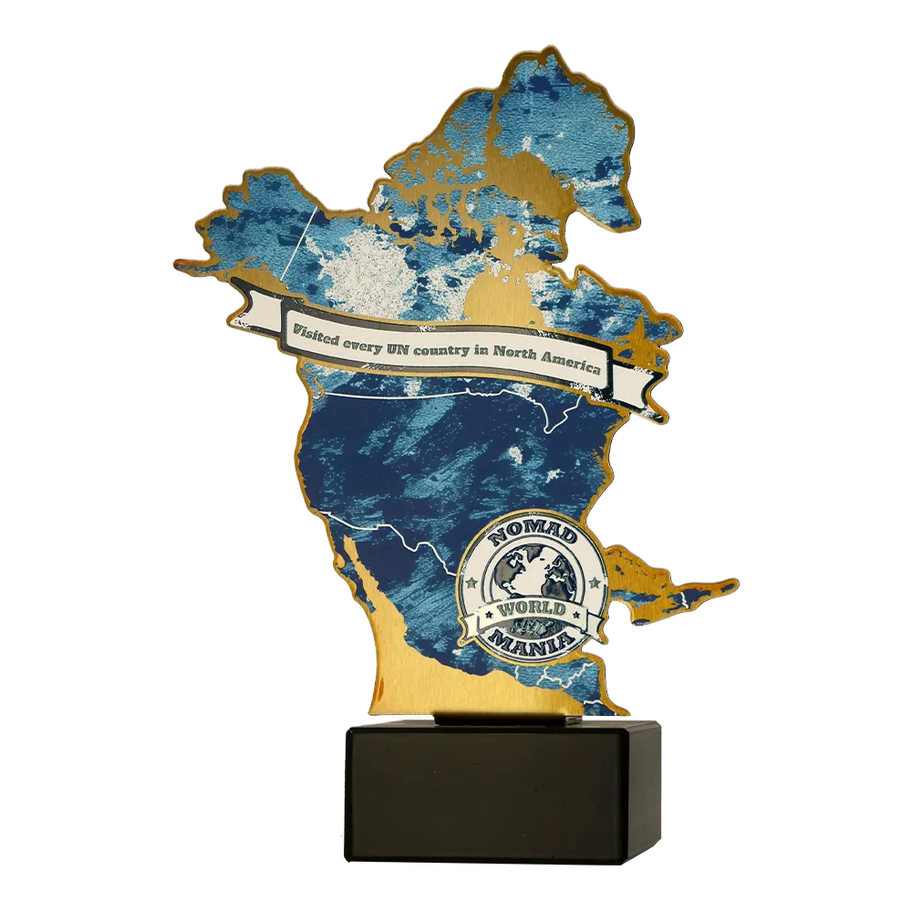 Il premio personalizzato "Nomad World Mania" è stato creato come ricordo unico per i viaggiatori che hanno visitato ogni paese riconosciuto dall'ONU in Nord America. Questo premio celebra la passione per l'esplorazione e i risultati globali. Realizzato in metallo con stampa UV, garantisce una rappresentazione dettagliata della mappa e la durata del colore.