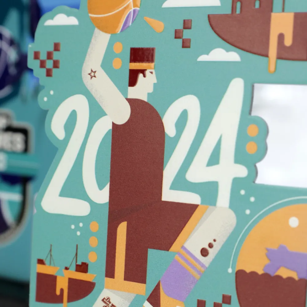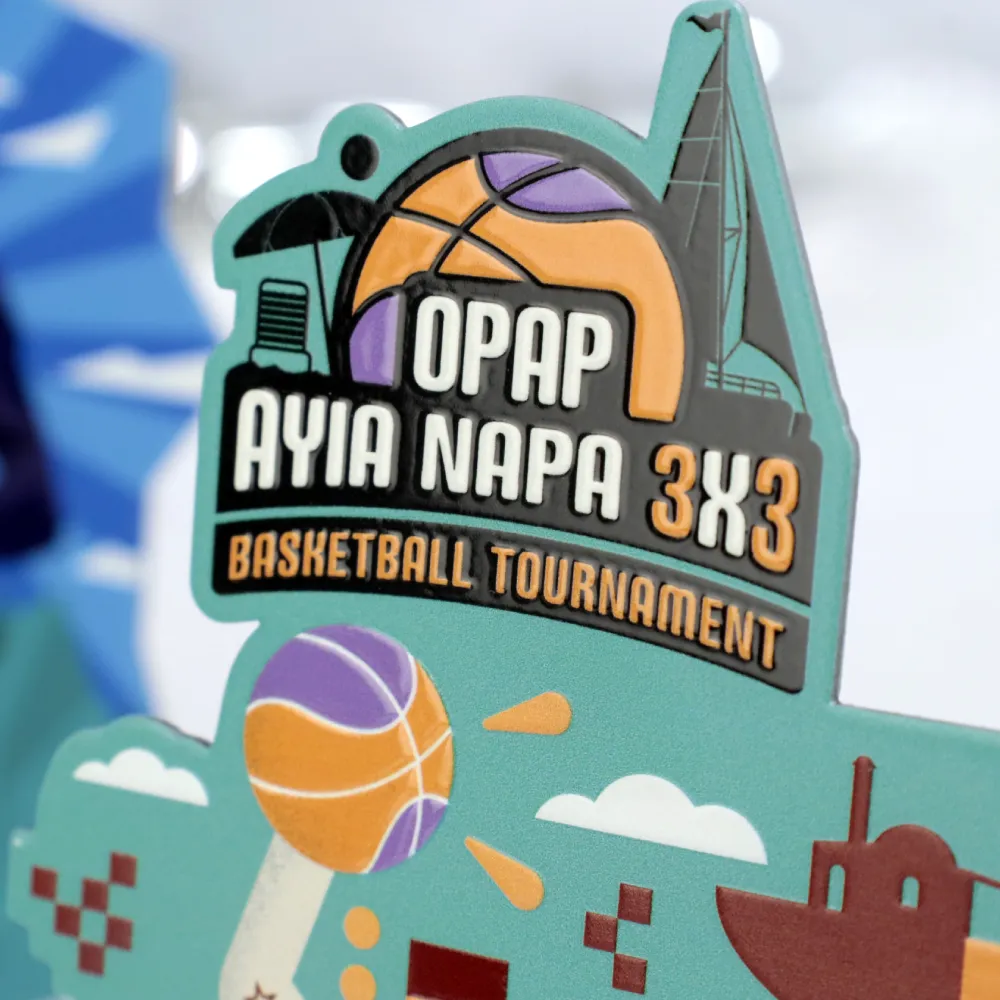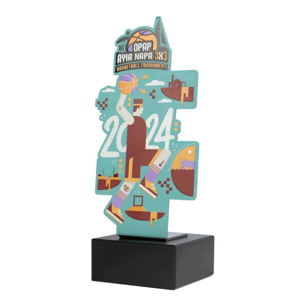 Un trofeo di basket colorato progettato per il torneo di basket OPAP Ayia Napa. Il premio è realizzato in acciaio di alta qualità, rivestito con colori vivaci utilizzando la stampa UV. Al centro del trofeo c'è una figura dinamica di un giocatore di basket.