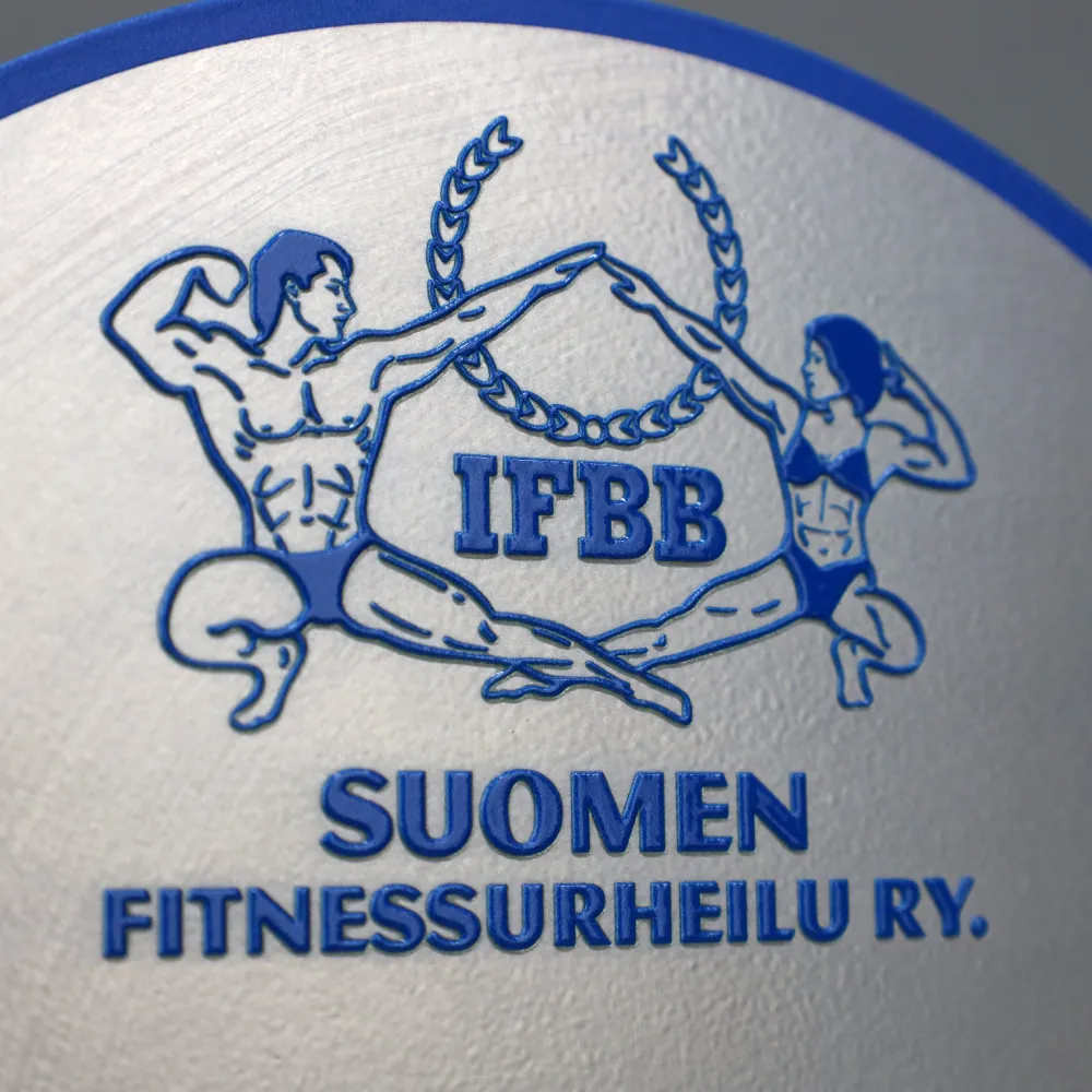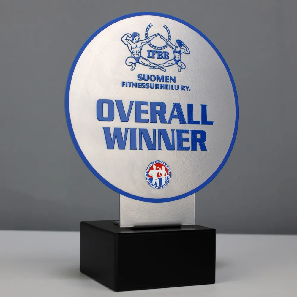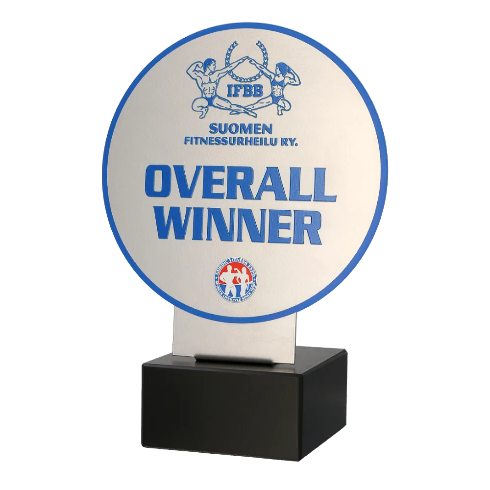 Una silhouette bella e scolpita è senza dubbio il segno distintivo degli atleti. Ecco perché alcuni di loro decidono di partecipare a competizioni uniche, durante le quali il ruolo principale è giocato dalla perfetta presentazione di una figura sportiva ideale. Il vincitore di una tale competizione dovrebbe, quindi, ricevere un premio che appaia splendido quanto il suo corpo. Un esempio di tale premio è un trofeo in metallo preparato su ordine individuale da Winmed per il Vincitore Assoluto (Overall Winner). Abbiamo tagliato la sua forma rotonda utilizzando un laser, il che ci ha permesso di ottenere un effetto incredibilmente preciso. Inoltre, abbiamo applicato una stampa colorata sulla superficie metallica, poi ricoperta con una vernice lucida. Abbiamo posizionato il tutto su una massiccia base in marmo nero.