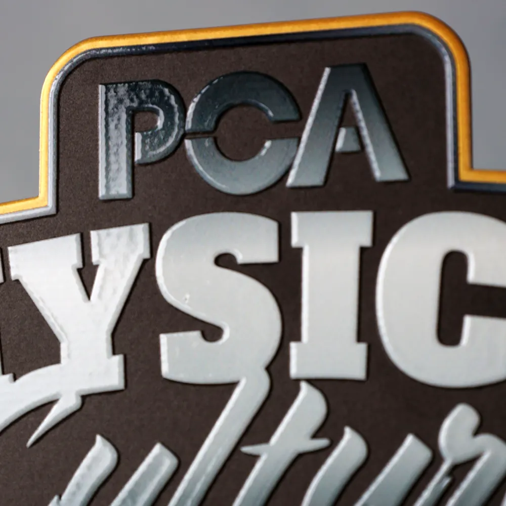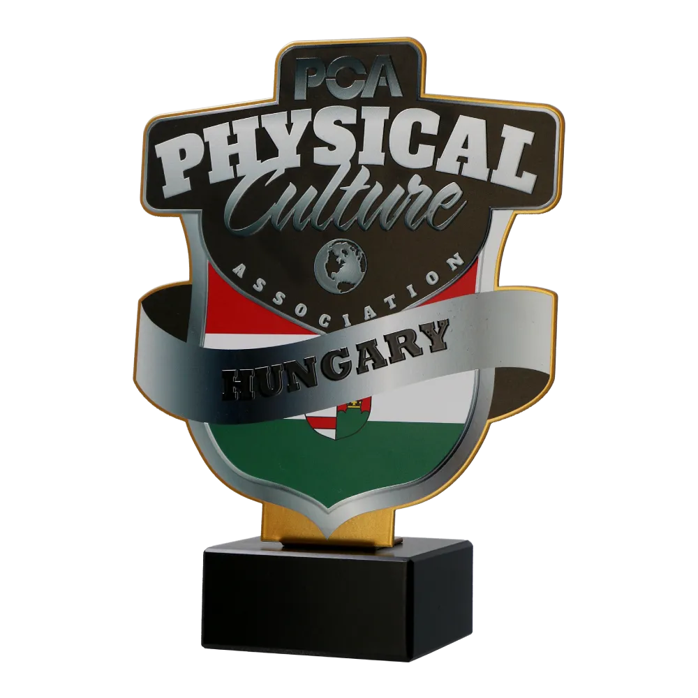 Le statuette che abbiamo preparato per PCA Hungary sono premi unici con un carattere forte. Realizzate in metallo tagliato con precisione, ricordano il logo dell’evento, creando un simbolo riconoscibile per ogni appassionato di bodybuilding. Le statuette sono ricoperte con stampa UV colorata, che, in alcuni punti, ha un effetto tridimensionale. Questo aggiunge un elemento di sorpresa e innovazione. Inoltre, la combinazione di colori del trofeo è ispirata alla bandiera ungherese, e l’iscrizione prominente con il nome del paese è posizionata nella parte centrale. Sopra di essa, è visualizzato il nome dell’evento, creando un ricordo indimenticabile per i vincitori. L’intero pezzo è montato su una base in marmo, aggiungendo eleganza e stabilità.