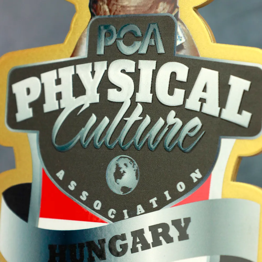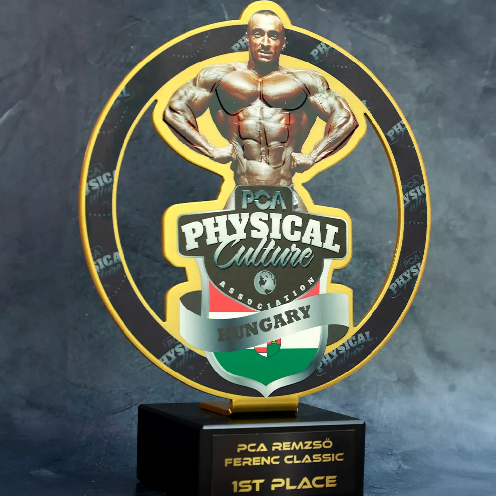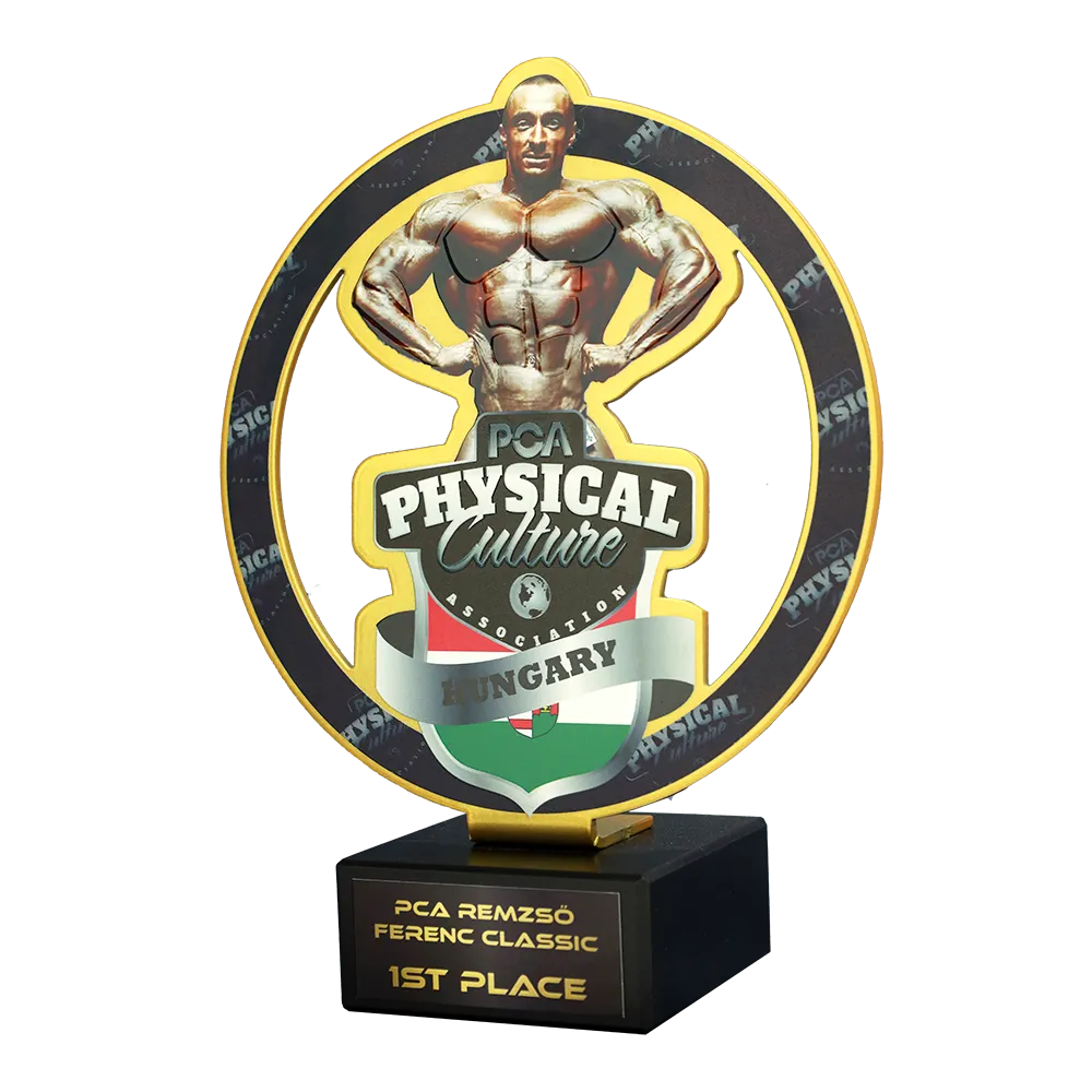 Un trofeo di bodybuilding creato per PCA Remzső Ferenc Classic, che mostra una silhouette in metallo di un bodybuilder posizionata su una base in marmo. Le decorazioni vivaci, ottenute tramite stampa UV, conferiscono al premio un tocco distintivo.