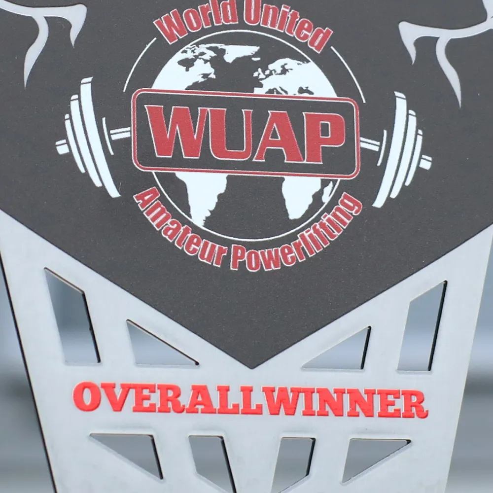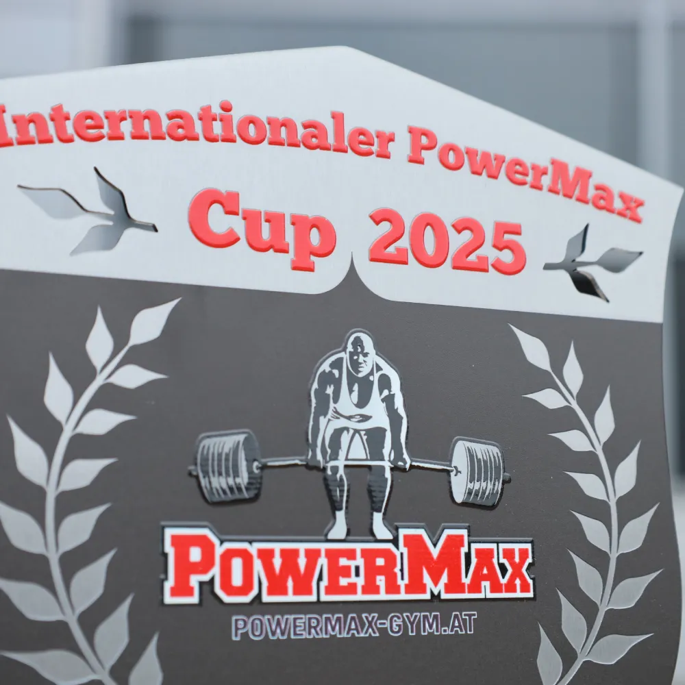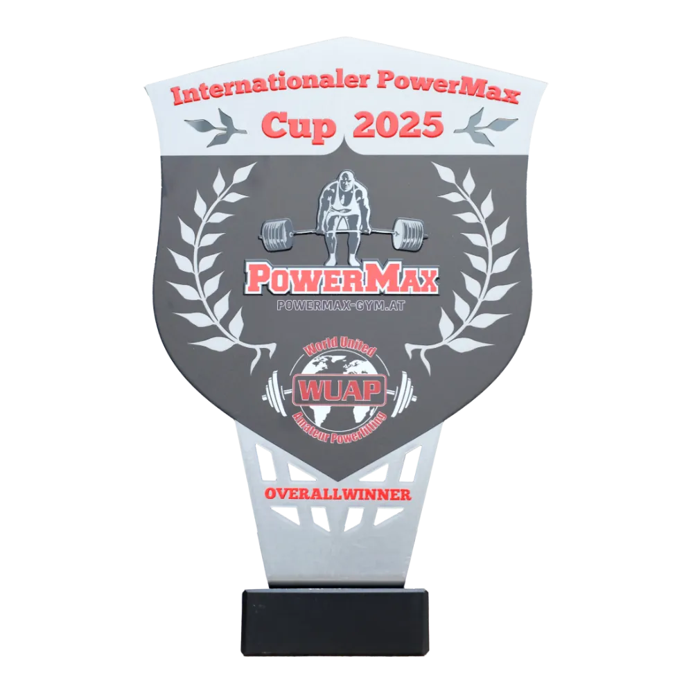 Un trofeo personalizzato che abbiamo creato per l'Internationaler PowerMax Cup 2025. La sezione superiore l'abbiamo realizzata in metallo con stampa UV a colori e montata su una base nera per la stabilità. La parte anteriore ha la forma di uno scudo con la silhouette di un atleta che solleva un bilanciere, corone d'alloro e i loghi PowerMax e WUAP.