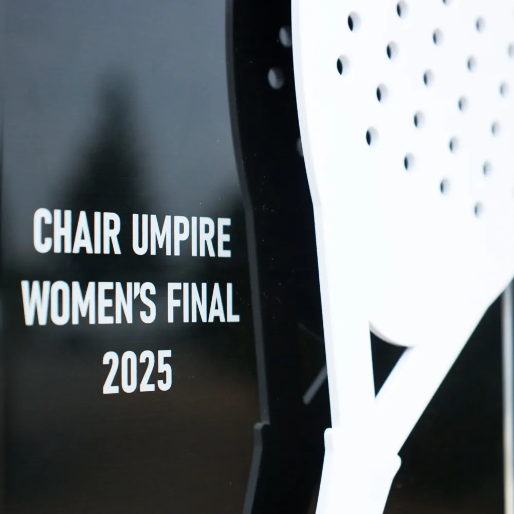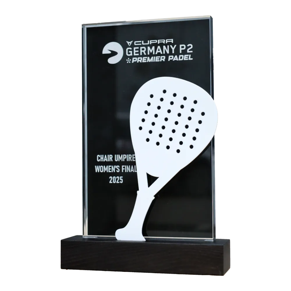 Per gli organizzatori del torneo Premier Padel, abbiamo creato una costruzione multistrato in cui una racchetta da padel in metallo tagliata con precisione è combinata con un pannello acrilico trasparente. L'intero pezzo è montato permanentemente su una base in legno naturale, conferendo a questo premio in acrilico peso e stabilità adeguati. L'applicazione della tecnologia di stampa UV ci ha permesso di applicare il branding con precisione fotografica, mantenendo la coerenza cromatica con l'identità visiva dell'evento.
