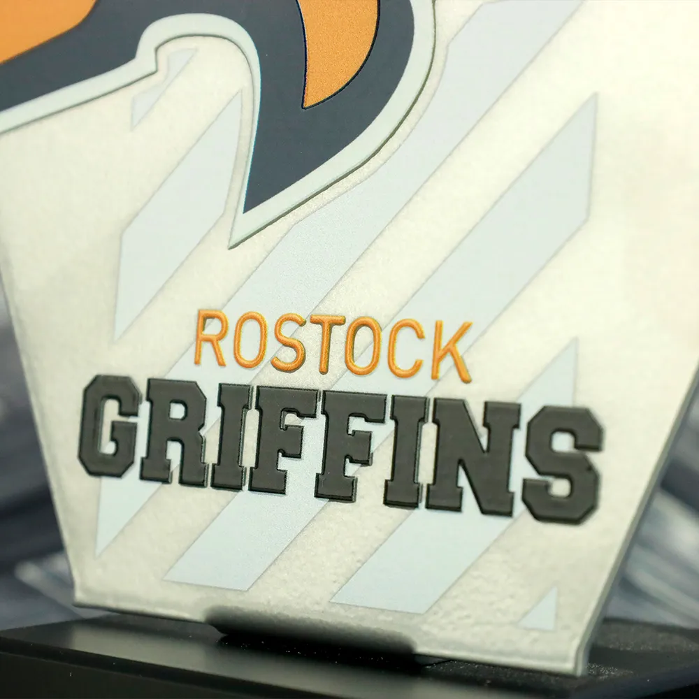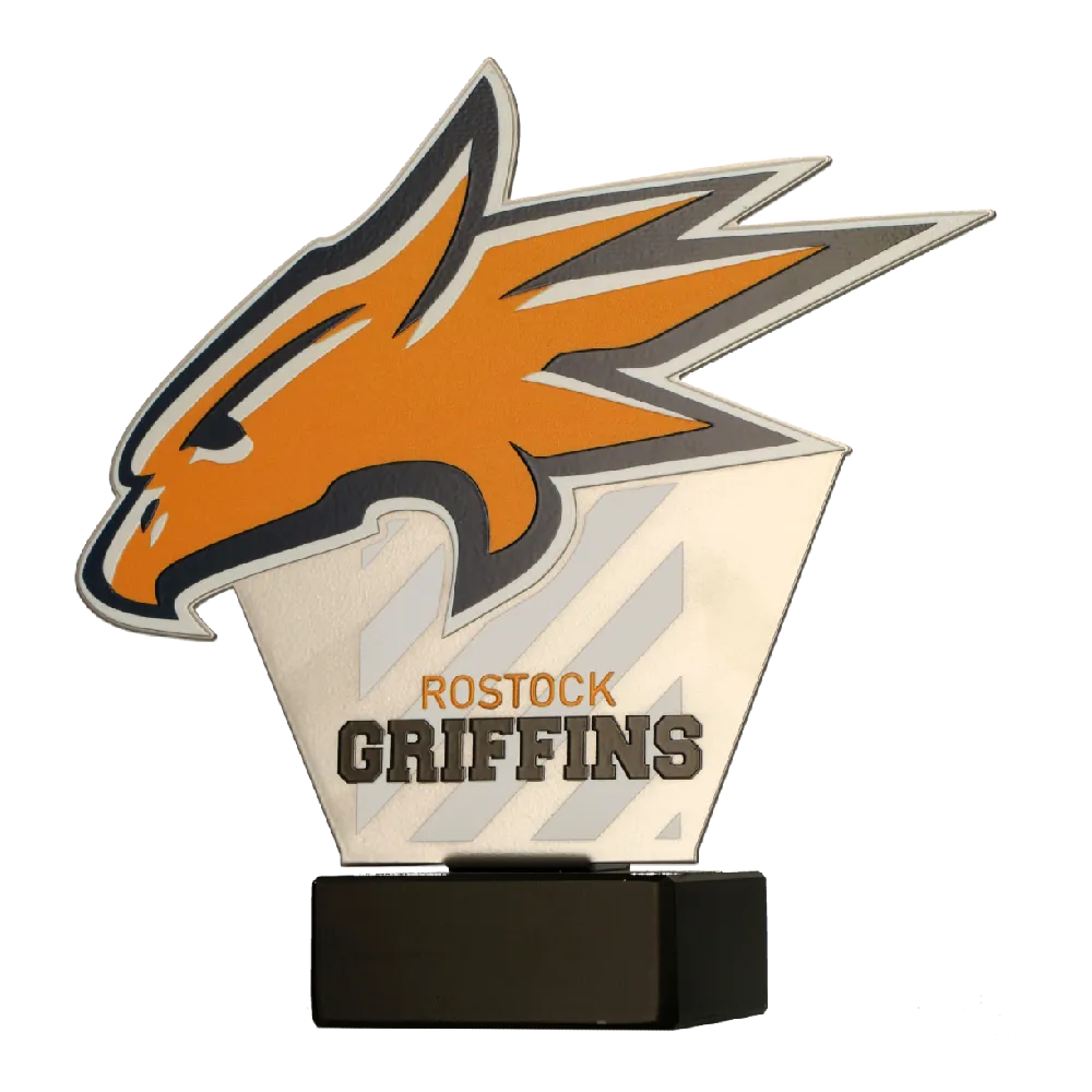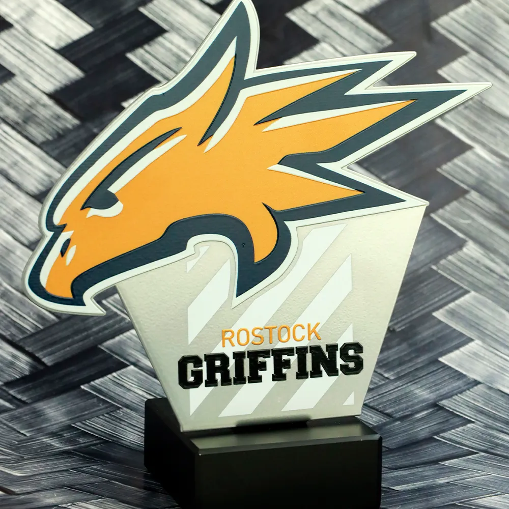 Un trofeo sportivo personalizzato realizzato per i Rostock Griffins presenta un design dinamico con aquila su una base in marmo. I colori vivaci sul premio sono stati applicati utilizzando la stampa UV.