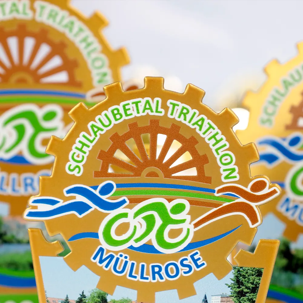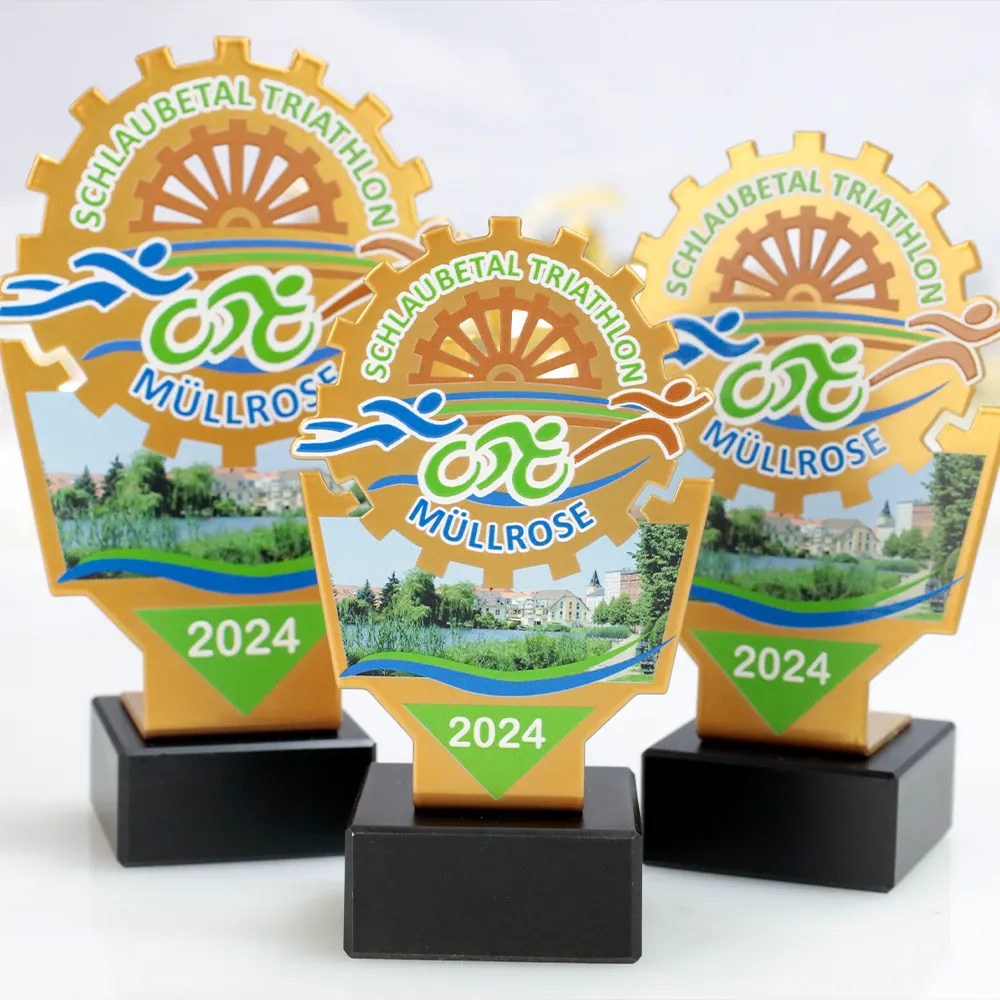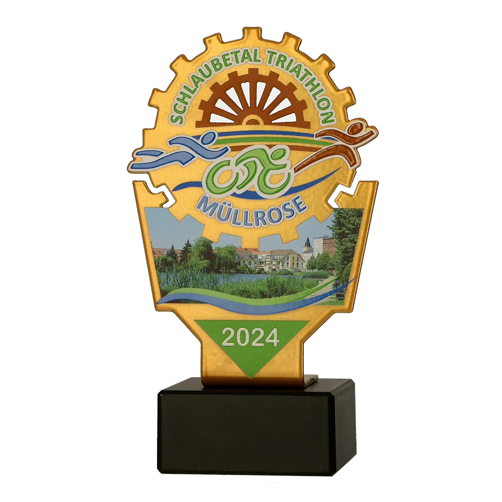 Un premio personalizzato realizzato per lo Schlaubetal Triathlon 2024. Il trofeo ha la forma di un ingranaggio con motivi di corsa, nuoto e ciclismo, nonché un paesaggio dell'evento. Le decorazioni colorate sono state applicate utilizzando la stampa UV e la forma è stata tagliata al laser. La parte superiore è in metallo e la base è in marmo.