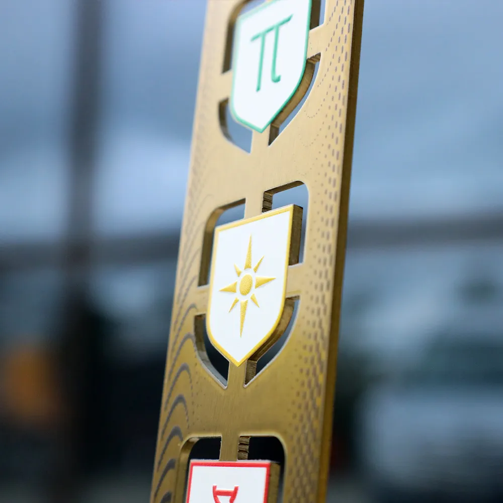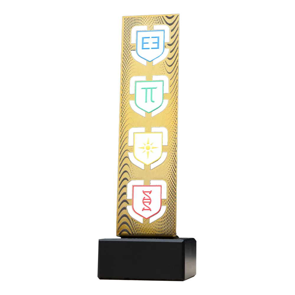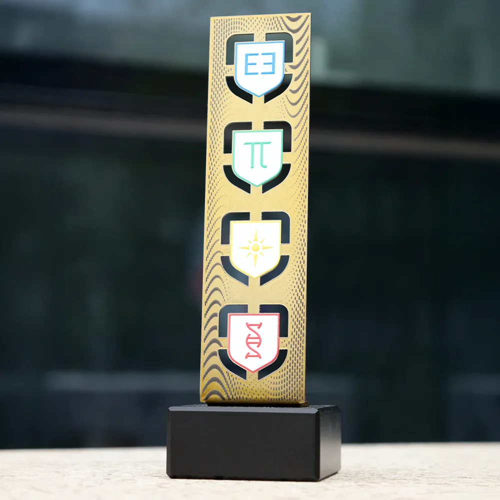 Per gli organizzatori dell'evento Science Tower, abbiamo creato questo trofeo su misura, combinando metallo tagliato con precisione con una solida base in marmo nero. L'intera struttura si distingue per l'uso della tecnologia di stampa UV, garantendo che i simboli colorati – dal numero Pi alla doppia elica del DNA – possiedano una durata e una saturazione del colore eccezionali. La superficie dorata è stata ulteriormente raffinata con un motivo delicato, dimostrando la nostra attenzione per ogni dettaglio tecnico della realizzazione.