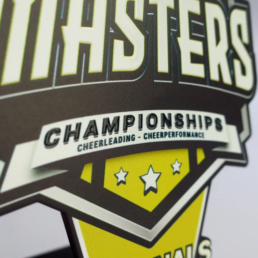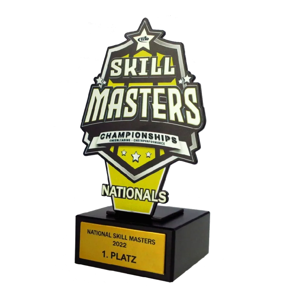 In effetti, in ogni evento sportivo c’è l’opportunità di distinguere qualcuno con un premio. Per questo motivo, la collezione di premi di ogni atleta è davvero ricca. Inoltre, è difficile sorprendere un partecipante plurititolato. La nostra azienda, che ogni giorno crea premi deliziosi su ordini individuali, raggiunge questo obiettivo. Uno di questi progetti è una statuetta colorata che abbiamo realizzato per il campionato di cheerleading Skill Masters. Questo trofeo in metallo è stato tagliato al laser, grazie al quale ha assunto una forma insolita. Inoltre, si distingue per la sua stampa espressiva e colorata. Il suo forte accento cattura lo sguardo e concentra l’attenzione, distinguendo il premio dagli altri.