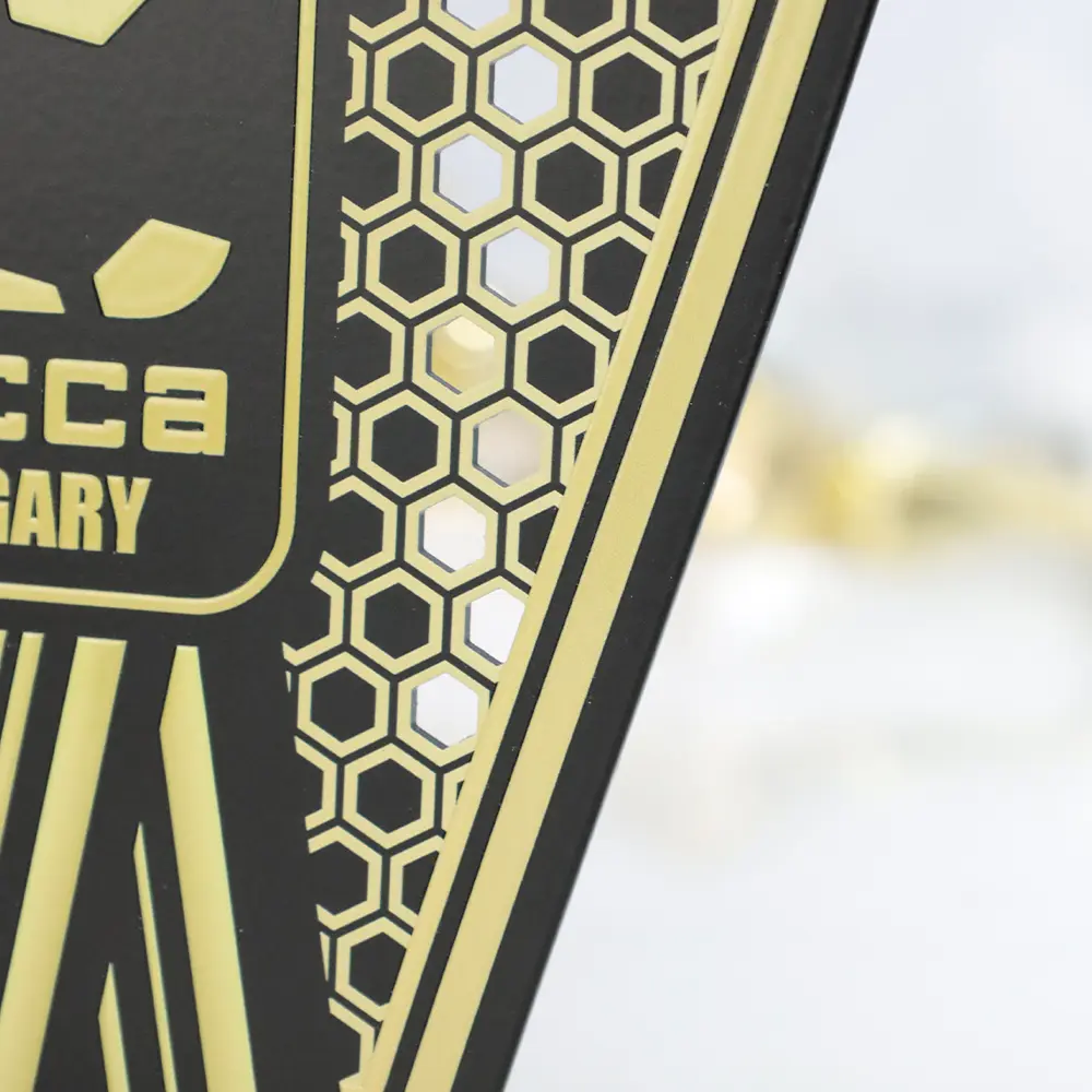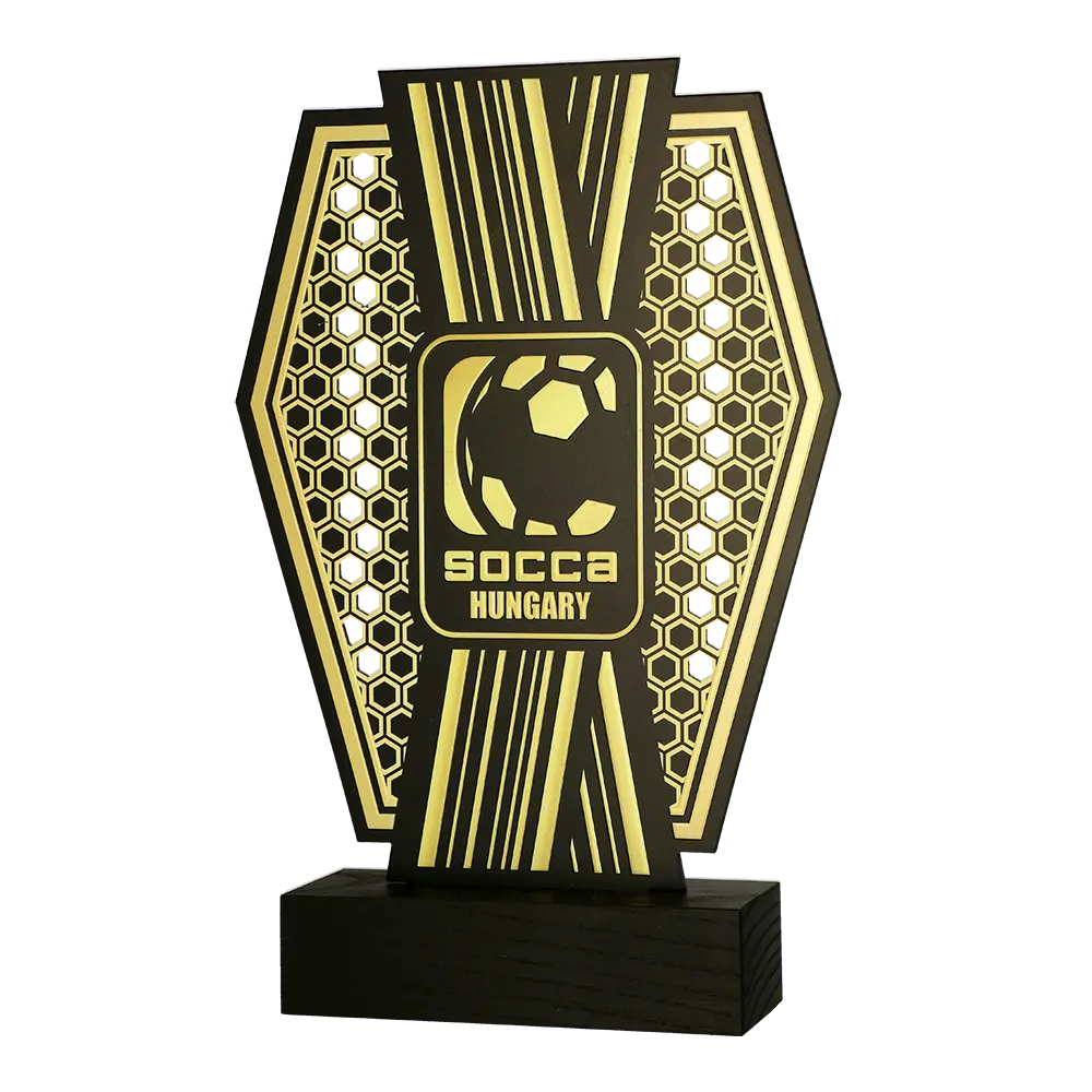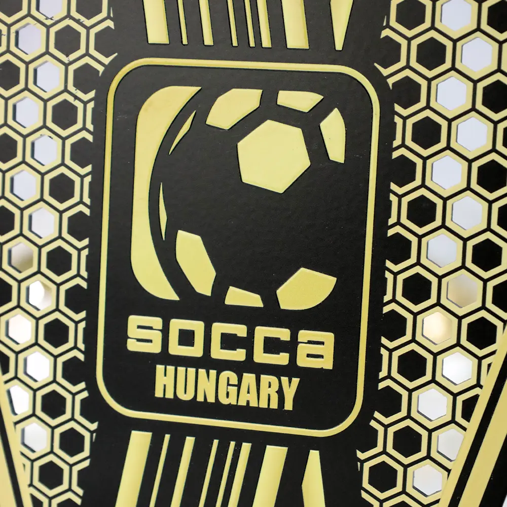 Il trofeo calcio creato per Socca Hungary è un premio moderno che si distingue per il suo design eccezionale. Realizzato in metallo, il trofeo presenta dettagli dorati prominenti su uno sfondo nero, conferendogli un aspetto prestigioso. Il motivo centrale è un pallone da calcio stilizzato circondato da un motivo geometrico che simboleggia il dinamismo e l'energia del gioco. Gli elementi sono stati tagliati con precisione e decorati con stampa UV, evidenziando ogni dettaglio. L'intero pezzo è montato su una solida base in legno.