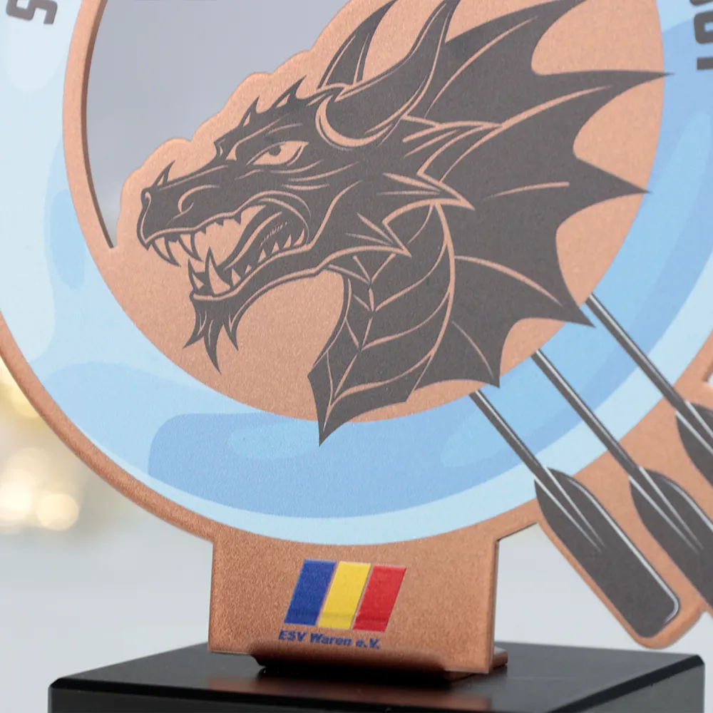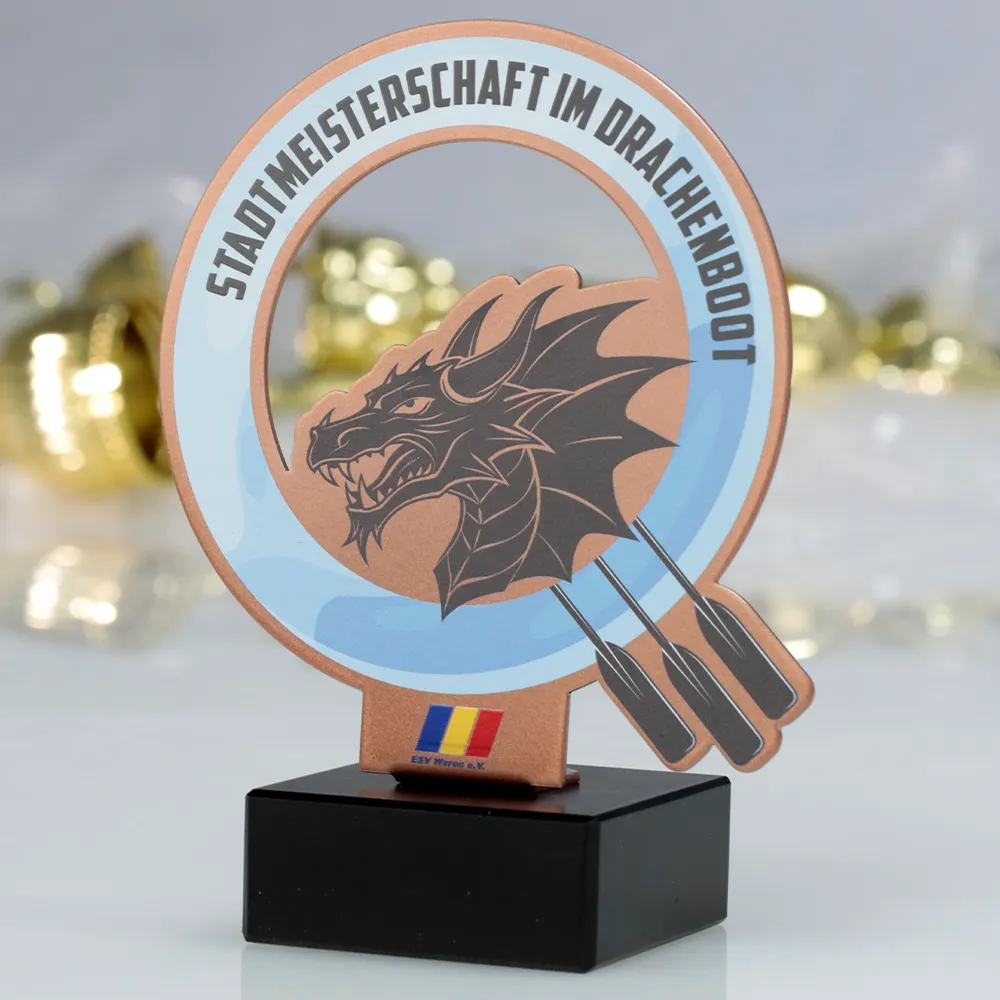 Trofeo canottaggio realizzato per i Campionati Cittadini di Dragon Boat. Il motivo centrale di un drago e dei remi evidenzia lo spirito della competizione. Realizzato in metallo con stampa UV, è montato su una base nera stabile. La personalizzazione include il nome dell'evento, il logo e accenti nazionali.