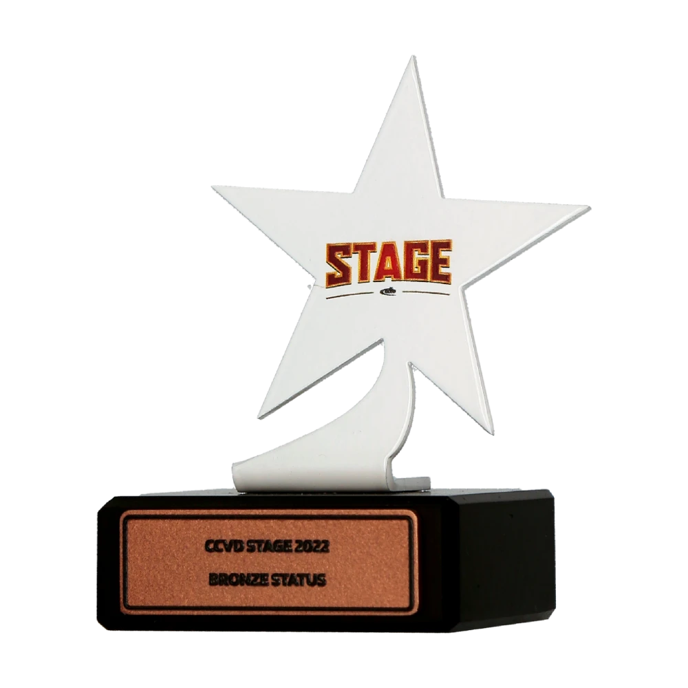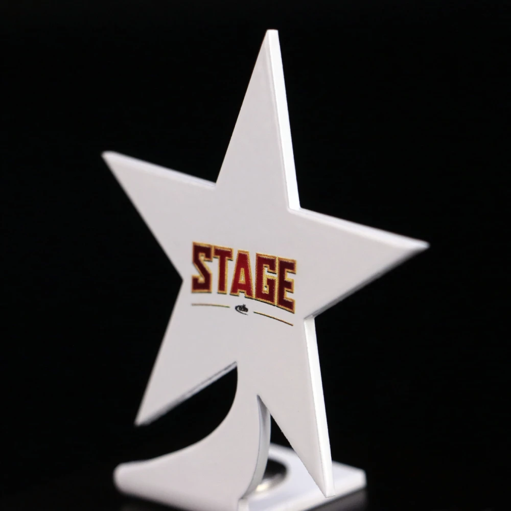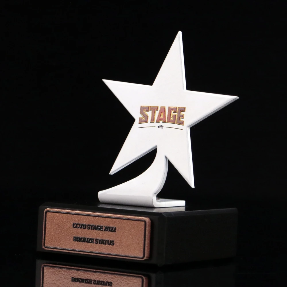 Un trofeo sportivo personalizzato a forma di stella su una base in marmo nero.