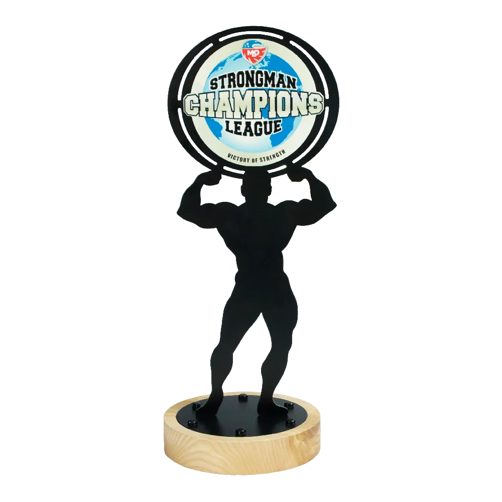 La Strongman Champions League è una vera chicca per i fan degli uomini forti e delle sfide estreme. È una serie globale di competizioni che riunisce i migliori atleti da tutto il mondo. Gli strongman competono in una varietà di discipline che mettono alla prova la loro forza, resistenza e tecnica. La Strongman Champions League non riguarda solo la forza fisica ma anche la strategia e la capacità di adattarsi a diverse discipline. Dal trascinare camion al sollevare pietre giganti fino a combattere contro il tempo e le debolezze personali, ogni concorrente deve mostrare versatilità e determinazione per vincere l’ambito titolo di campione. Ringraziamo gli organizzatori di queste competizioni per averci permesso di farne parte creando per loro un trofeo personalizzato. Il premio presenta la silhouette di un uomo che tiene una grande pietra rotonda sopra la testa. Su di essa, abbiamo posizionato il motto e il logo di queste competizioni. Il tutto poggia su una base rotonda in legno, e la figura dello strongman è realizzata in acciaio nero.