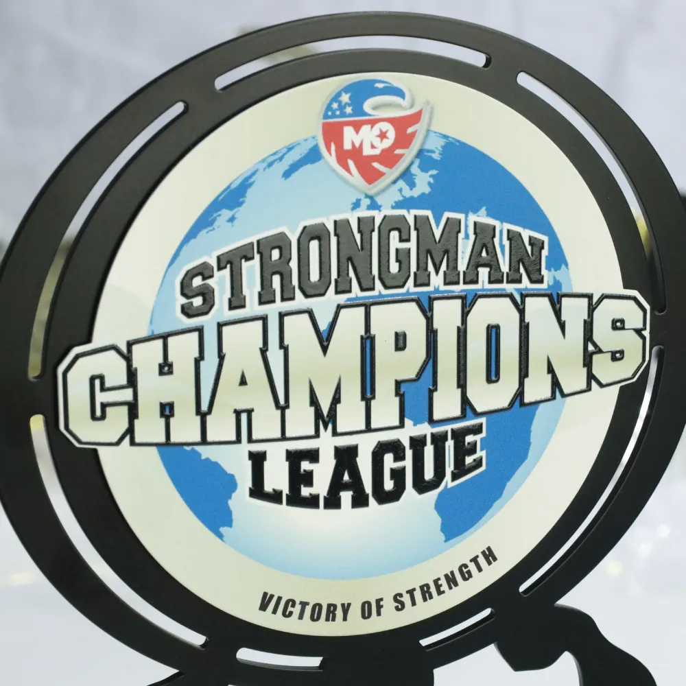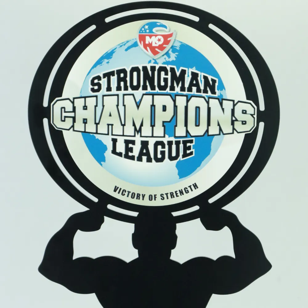 I trofei personalizzati per i migliori concorrenti nelle gare di strongman sono realizzati in acciaio e adornati con colori vivaci utilizzando la tecnologia di stampa UV. L'intero pezzo è posizionato su una base in legno.