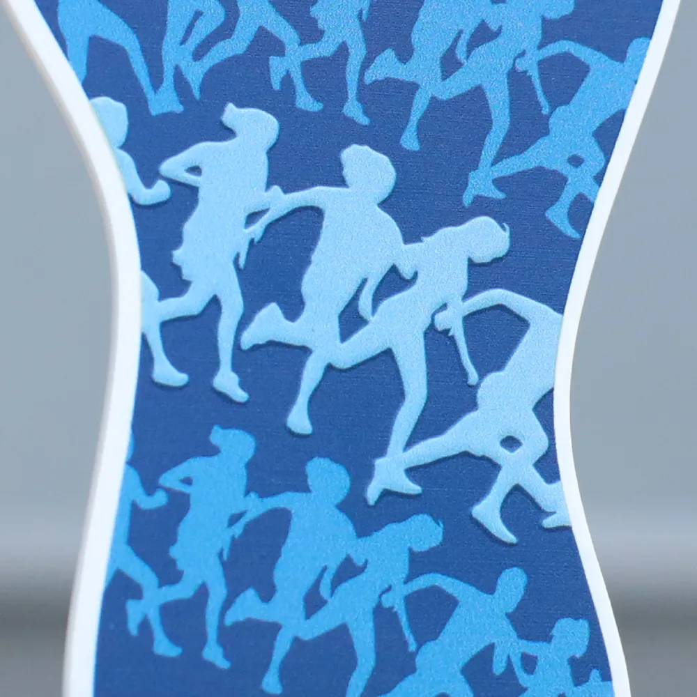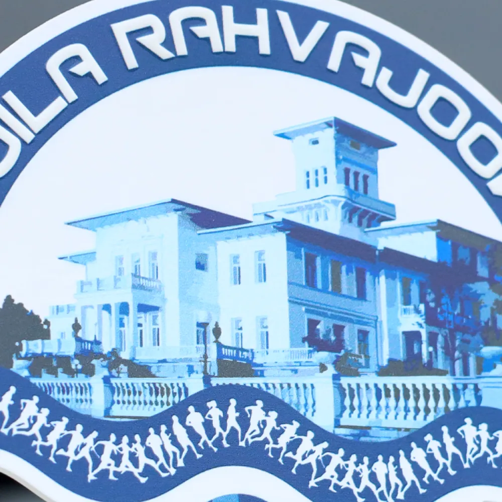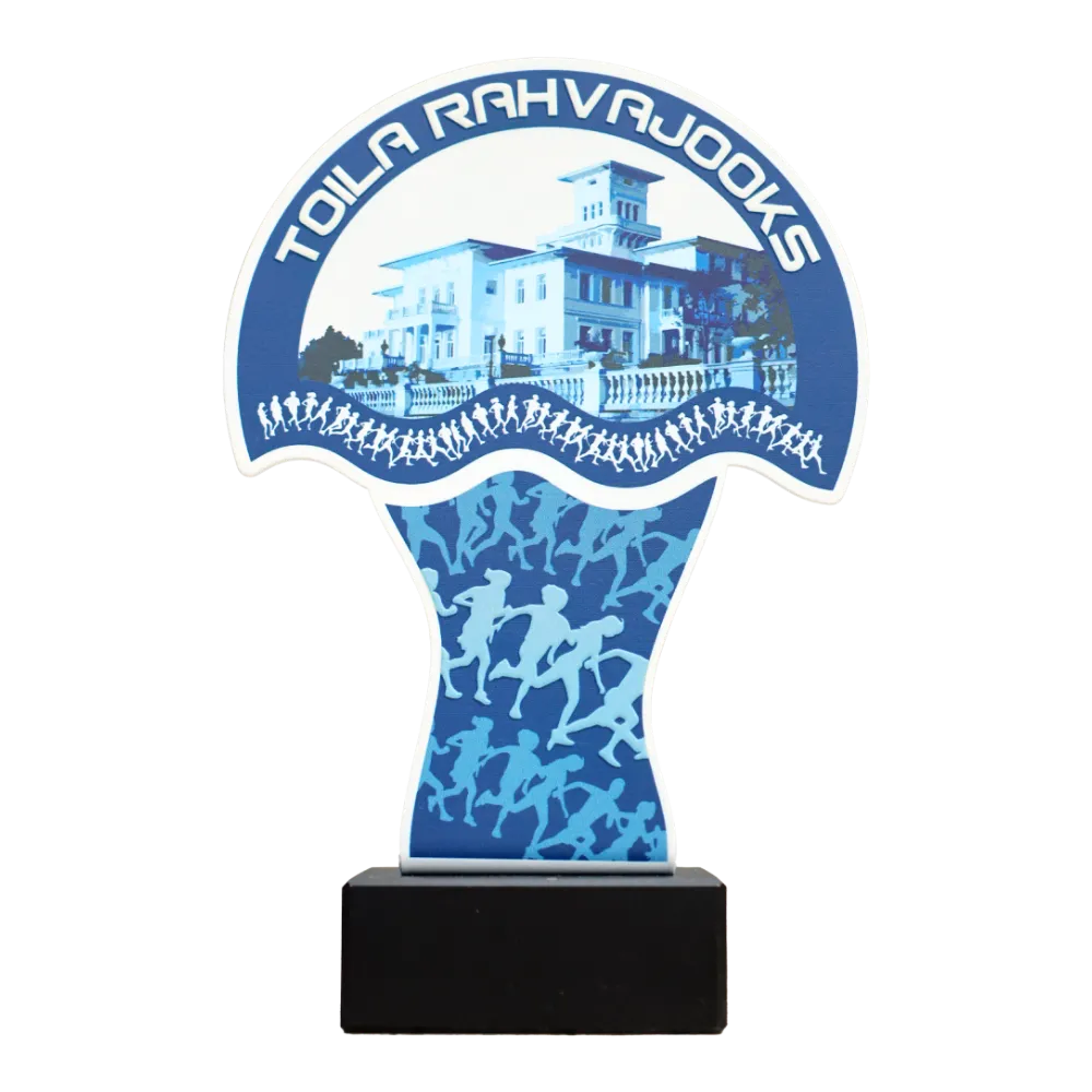 Un trofeo personalizzato che abbiamo preparato per Toila Rahvajooks. La parte anteriore mostra un panorama di un edificio con il nome dell'evento in un arco e una fascia di sagome di corridori, mentre il formato ha un contorno irregolare con una parte superiore allargata. Il pezzo è realizzato in metallo con stampa UV a colori nelle tonalità del blu e del bianco. Il premio poggia su una base in marmo nero per stabilità e contrasto.