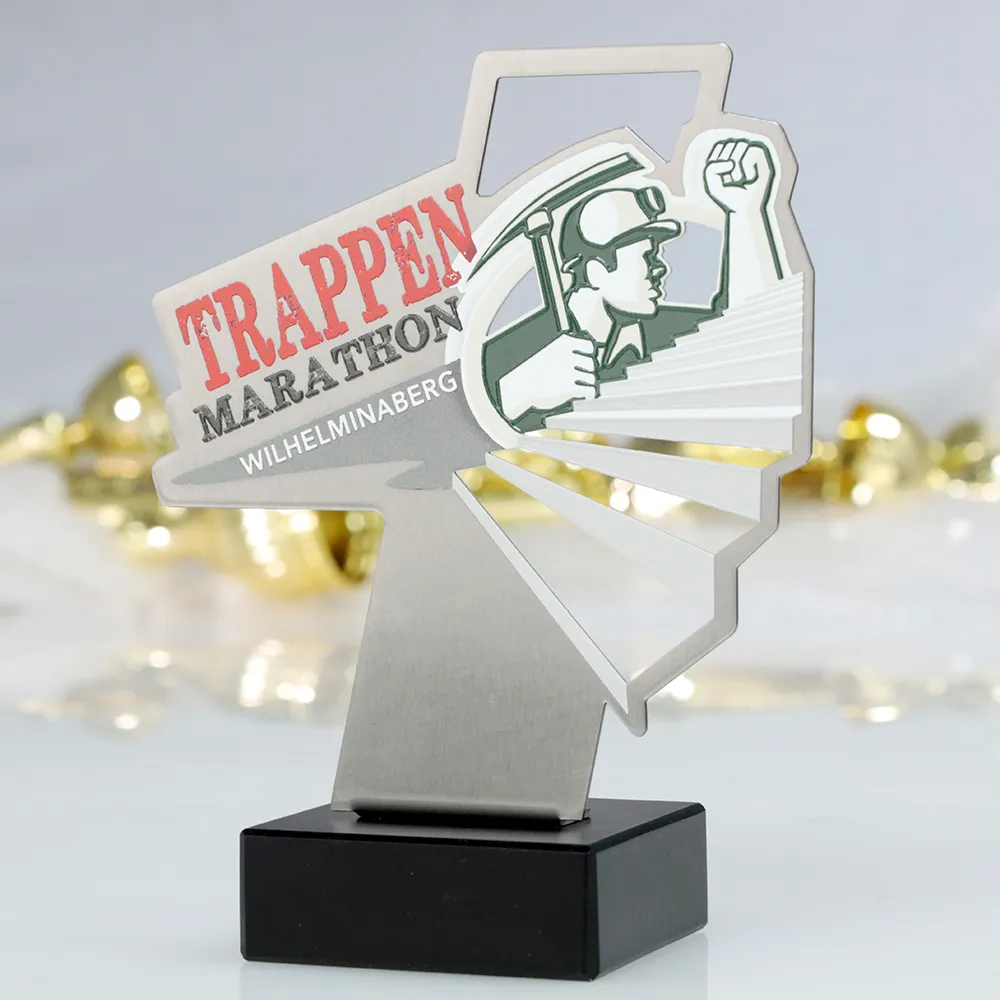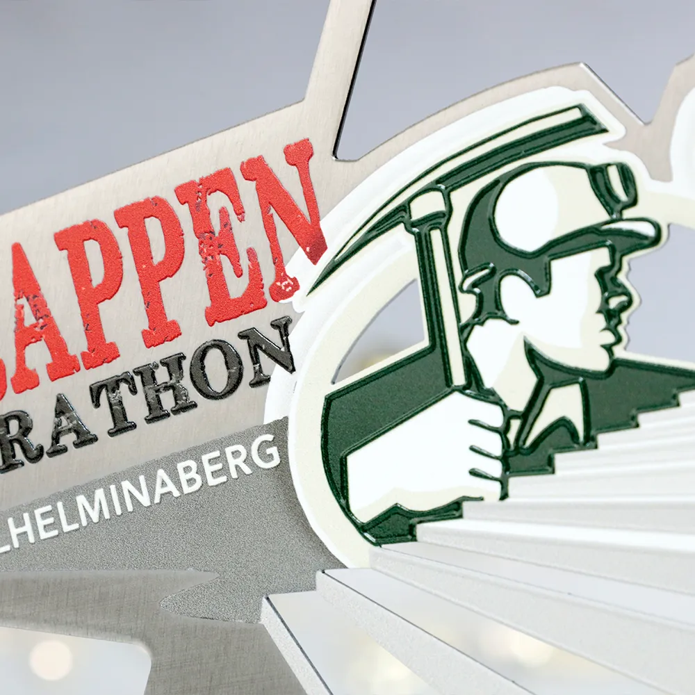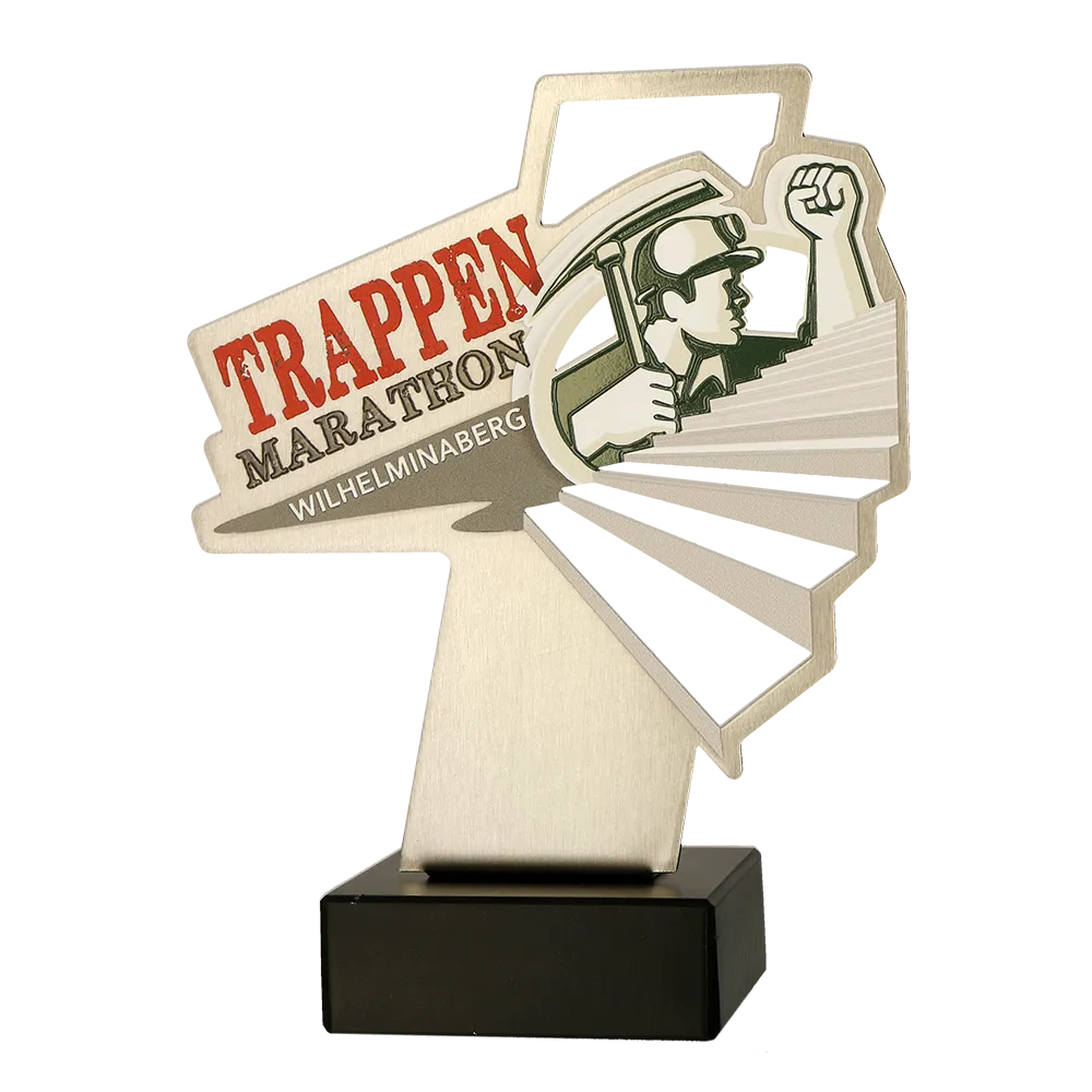 Premio running appositamente progettato per la Trappen Marathon tenutasi a Wilhelminaberg. La caratteristica centrale del design è una grafica di un minatore con un piccone, che riflette la storia della regione, combinata con un motivo a scala. Utilizzando la tecnologia di taglio laser e la stampa UV, i dettagli grafici, inclusi il logo e il nome dell'evento, sono stati perfettamente riprodotti.