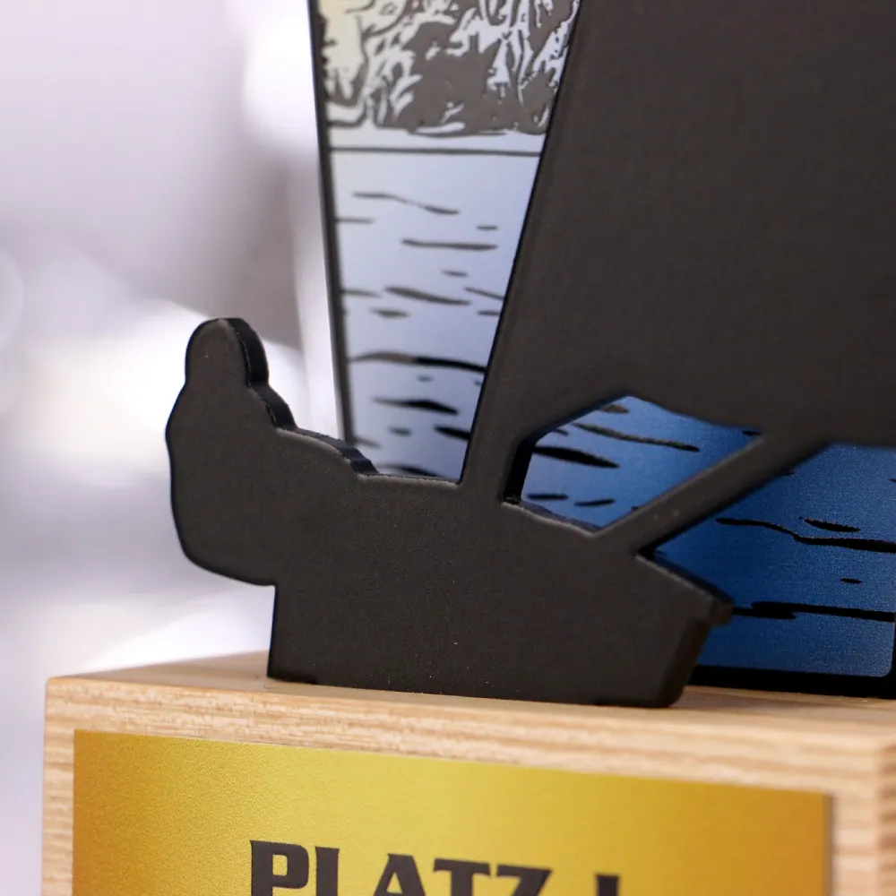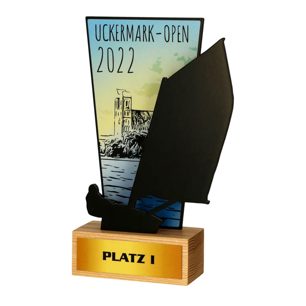Ogni vittoria ha il suo carattere individuale. È simile con i premi che creiamo per i nostri clienti ogni giorno da Winmed. Uno di questi progetti unici è la statuetta che abbiamo realizzato per l’Uckermark-Open. Questi trofei sono stati creati combinando due pannelli di metallo. Su uno di essi abbiamo posizionato una distintiva stampa colorata, mentre l’altro è stato ritagliato in una forma caratteristica della vela. Entrambi gli elementi richiamano perfettamente il clima di questa competizione sportiva, attirando lo sguardo con una finitura perfetta. La statuetta è stata posizionata su una base in legno e ad essa è attaccata una targhetta con le informazioni sul posto occupato dal concorrente.
