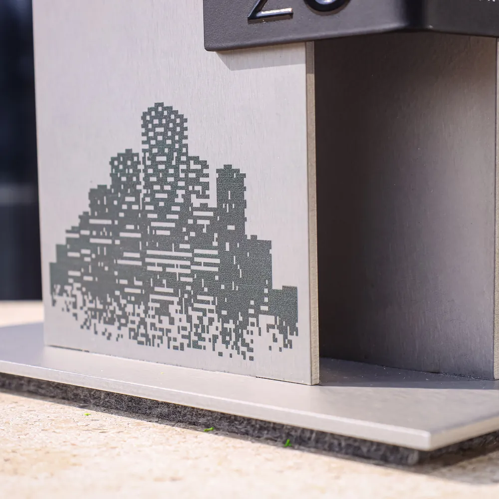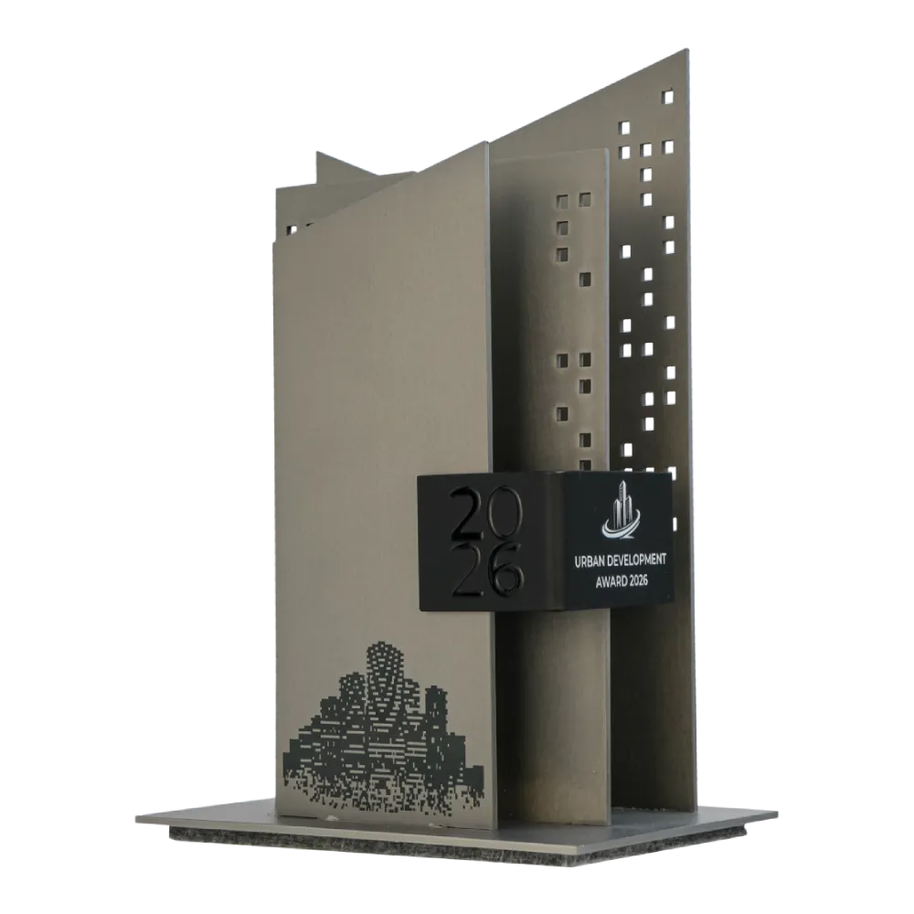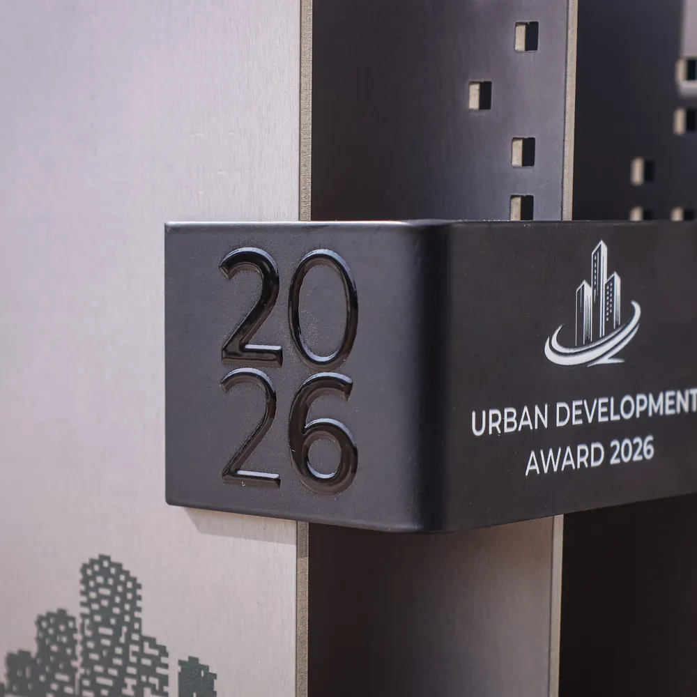 El premio a medida Urban Development Award 2026 es una construcción moderna y estratificada formada por paneles metálicos de distintas alturas que evocan el horizonte de una ciudad. El elemento central es una franja negra con impresión en relieve 3D, que incluye el año 2026 junto con el texto y el logotipo del premio. El panel metálico inferior presenta un sutil motivo gráfico con edificios, mientras que los paneles traseros lucen perforaciones decorativas que recuerdan a ventanas.