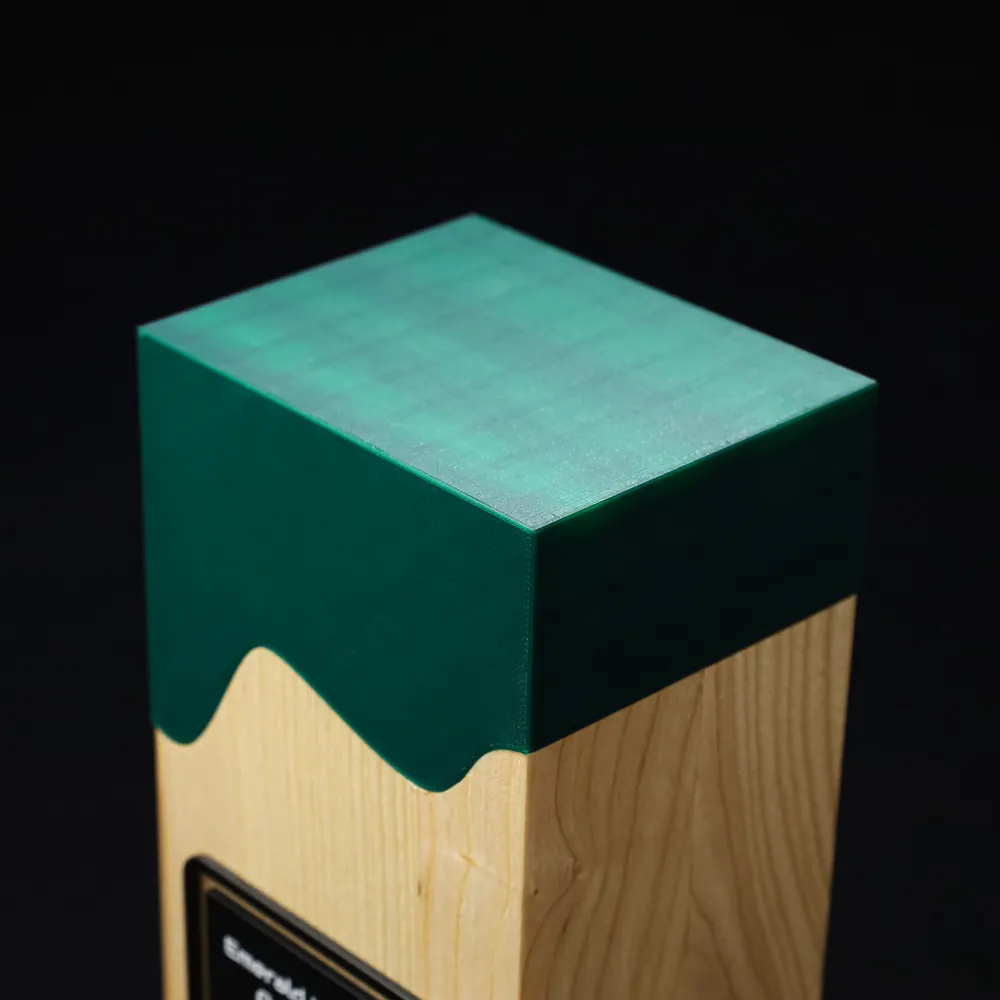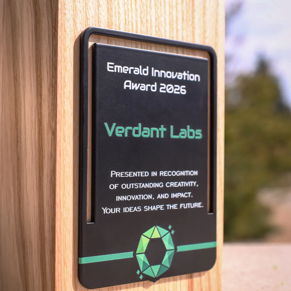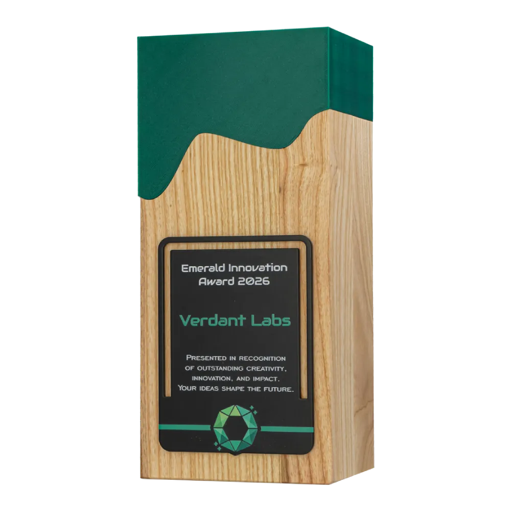 El trofeo columna Verdant Labs es un premio tallado en un bloque de madera maciza. El frente muestra una placa negra con personalización y logotipo a todo color, aplicados mediante impresión 3D de precisión.