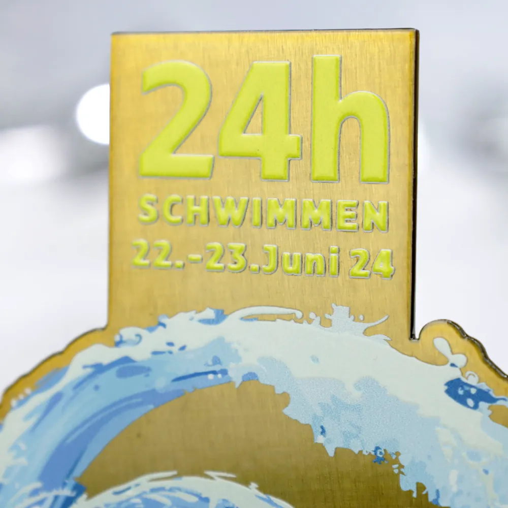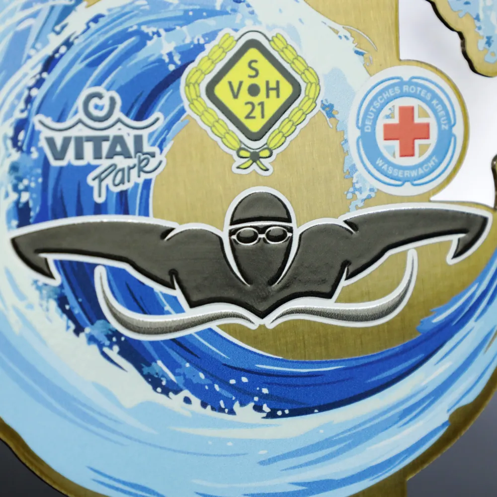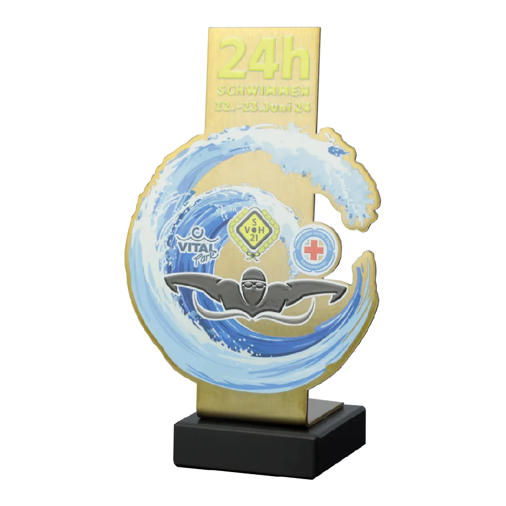 Un trofeo di nuoto personalizzato progettato specificamente per la competizione di nuoto VitalPark Schwimmen. Il trofeo è realizzato in acciaio di alta qualità, rivestito in oro, con una grafica che raffigura un nuotatore circondato da un'onda dinamica, stampata direttamente sul metallo utilizzando la moderna stampa UV.