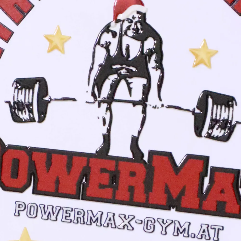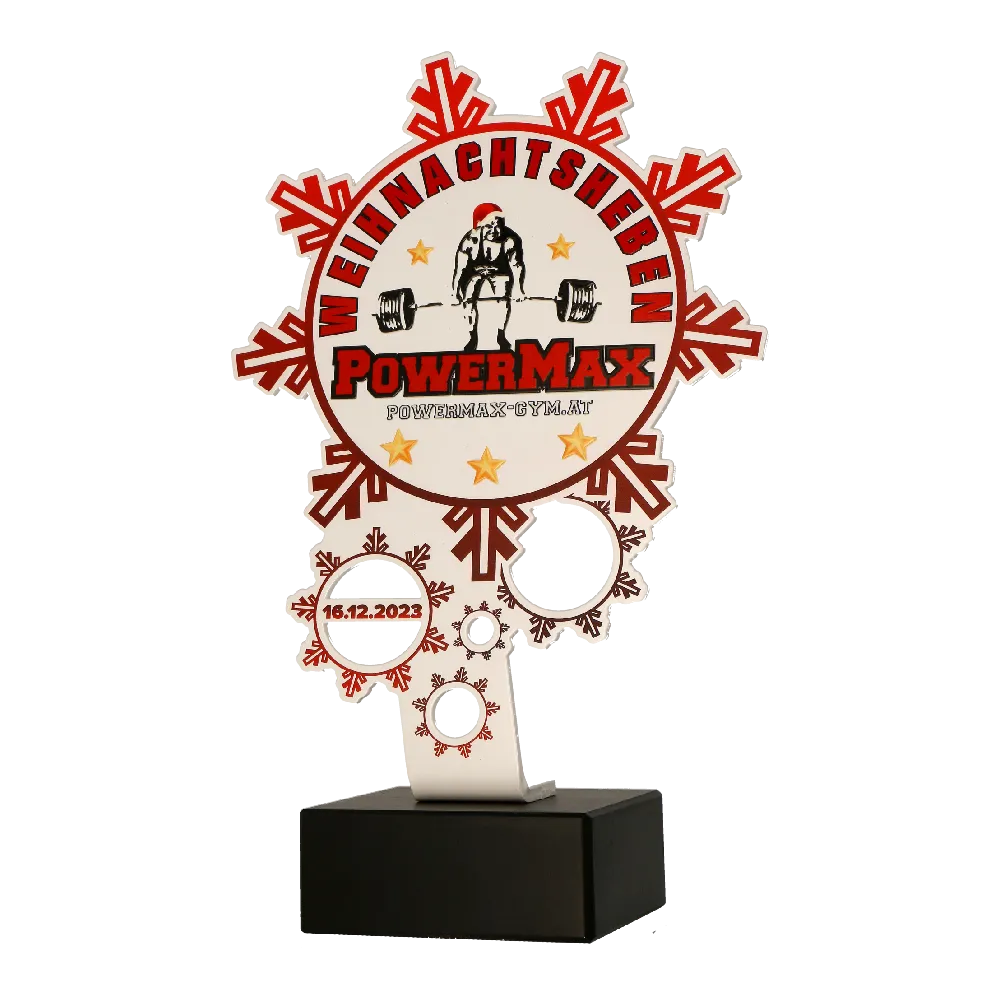 Un trofeo sportivo realizzato per Weihnachtsheben PowerMax. Ha la forma di un fiocco di neve con un logo della competizione posizionato centralmente e un'immagine di un atleta che solleva un peso. Costruito in metallo e posizionato su una base in marmo.