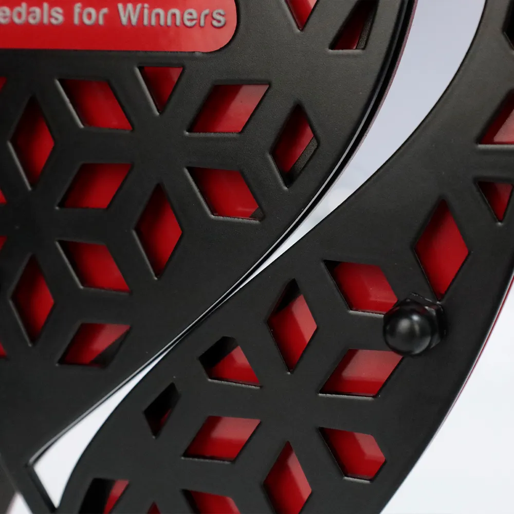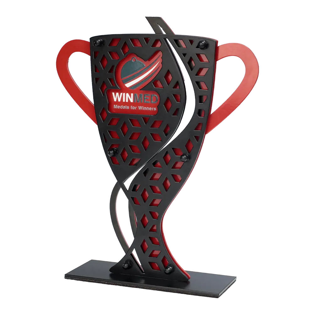 Un trofeo personalizzato creato da noi. Il trofeo è a forma di coppa con un design traforato che forma interessanti motivi geometrici. Il nostro logo è visualizzato sulla parte superiore, stampato utilizzando la stampa UV. Il trofeo, inclusa la base, è realizzato interamente in metallo, rendendolo robusto e durevole.