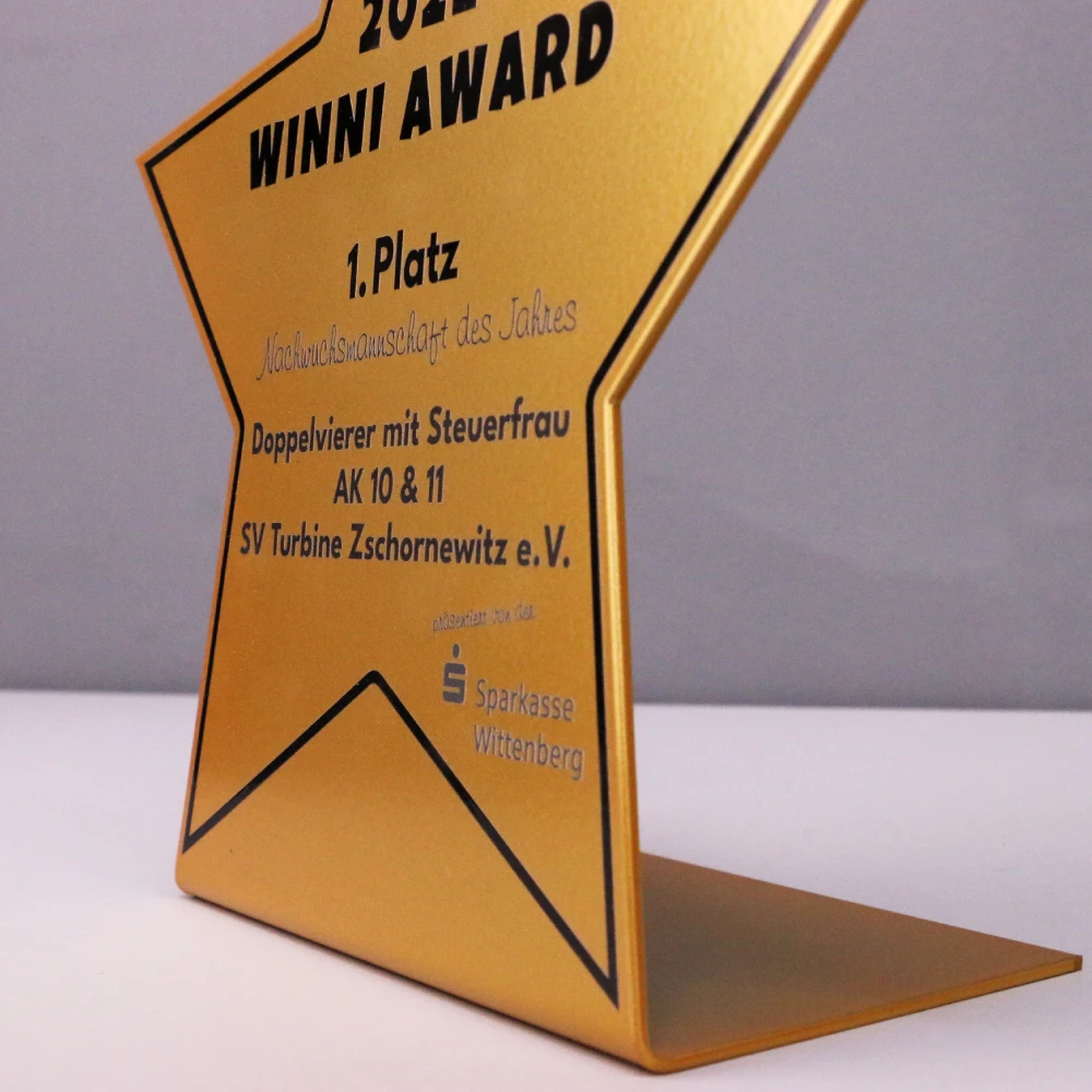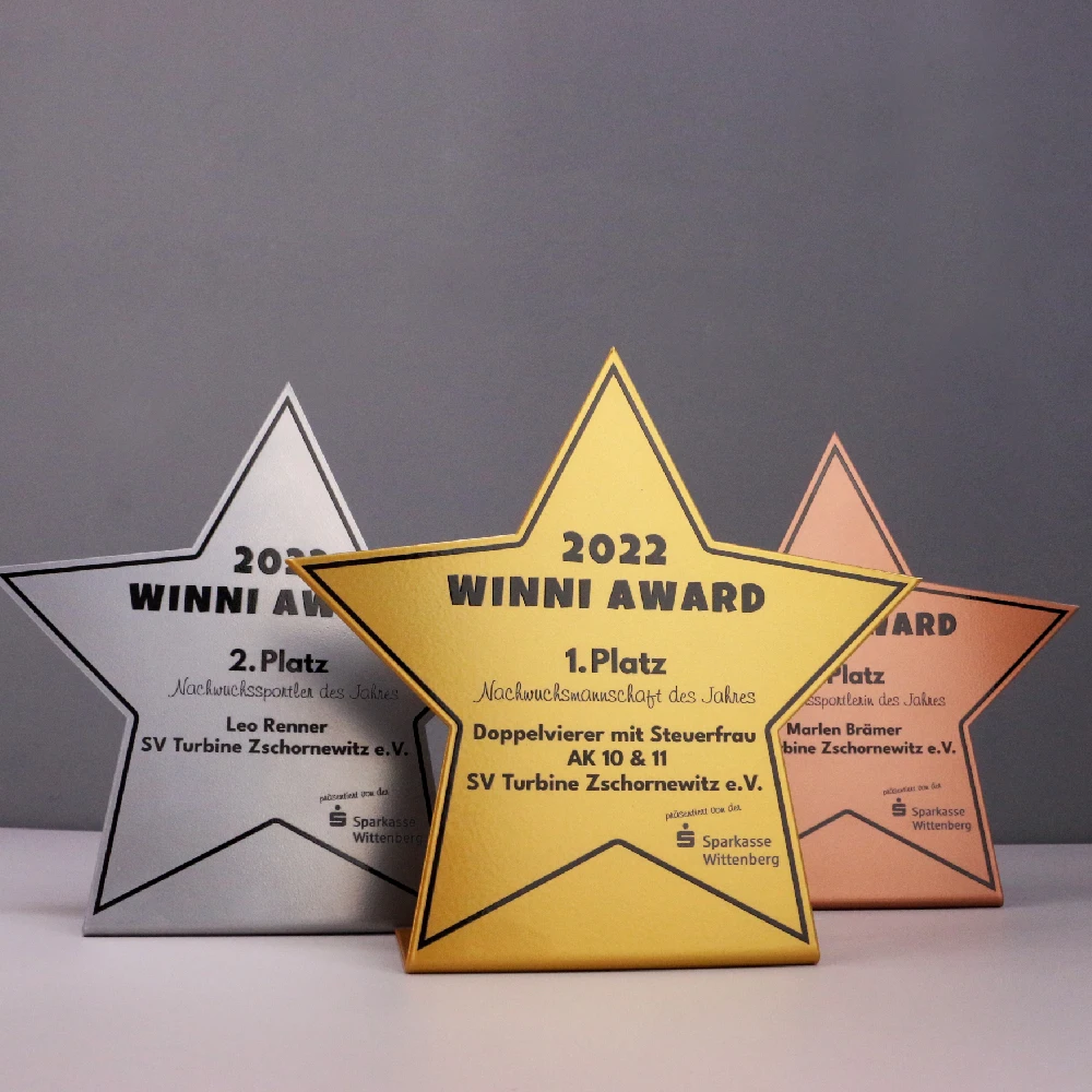 Quando si creano statuette diverse da tutte le altre, è importante affrontare ogni ordine individualmente. Da Winmed, lo sappiamo bene, come testimoniano le nostre realizzazioni innovative. Una di queste sono i trofei sportivi che abbiamo creato per il Winni Award. Si tratta di statuette realizzate in metallo piegato con uno spessore di 2 mm. Abbiamo ottenuto la plasticità del materiale utilizzando la tecnologia dei nostri macchinari all’avanguardia nel settore. Ci ha anche permesso di tagliare i trofei nell’originale forma a stella. Abbiamo realizzato il tutto in tre colori classici: oro, argento e bronzo. Questo ha permesso all’organizzatore di premiare ogni partecipante che è riuscito a conquistare un posto sul podio.
