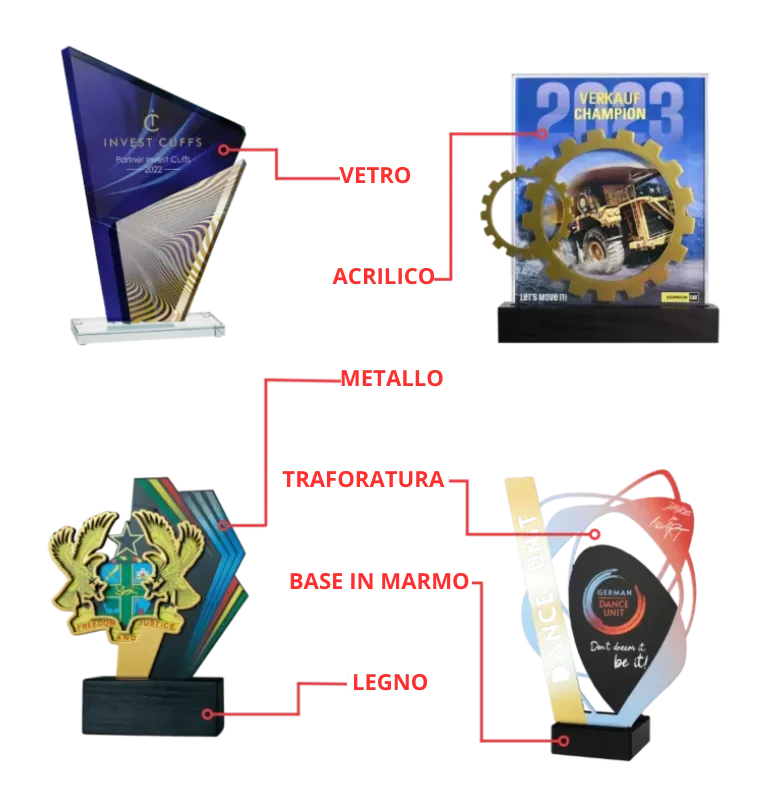 Creiamo premi unici, il cui carattere si adatta a occasioni di business, eventi speciali e competizioni sportive. Scegli tra vari materiali e tecniche adatte al tuo budget. I nostri prodotti si adattano a ogni disponibilità economica.